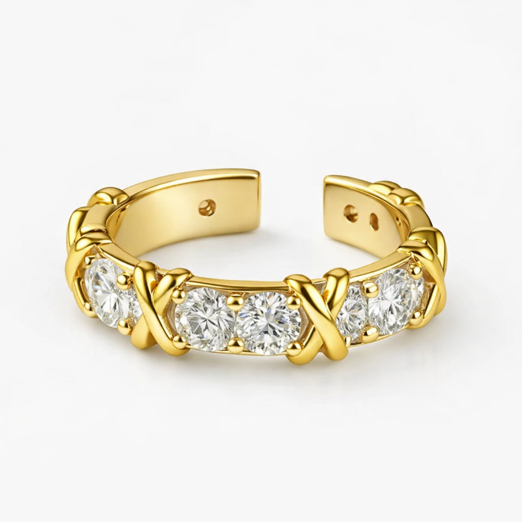 Ця каблучка поєднує блиск великих прозорих вставок і вишукані декоративні елементи у вигляді перехресних деталей. Двоколірний дизайн створює ефект контрасту та робить прикрасу яскравим акцентом образу.