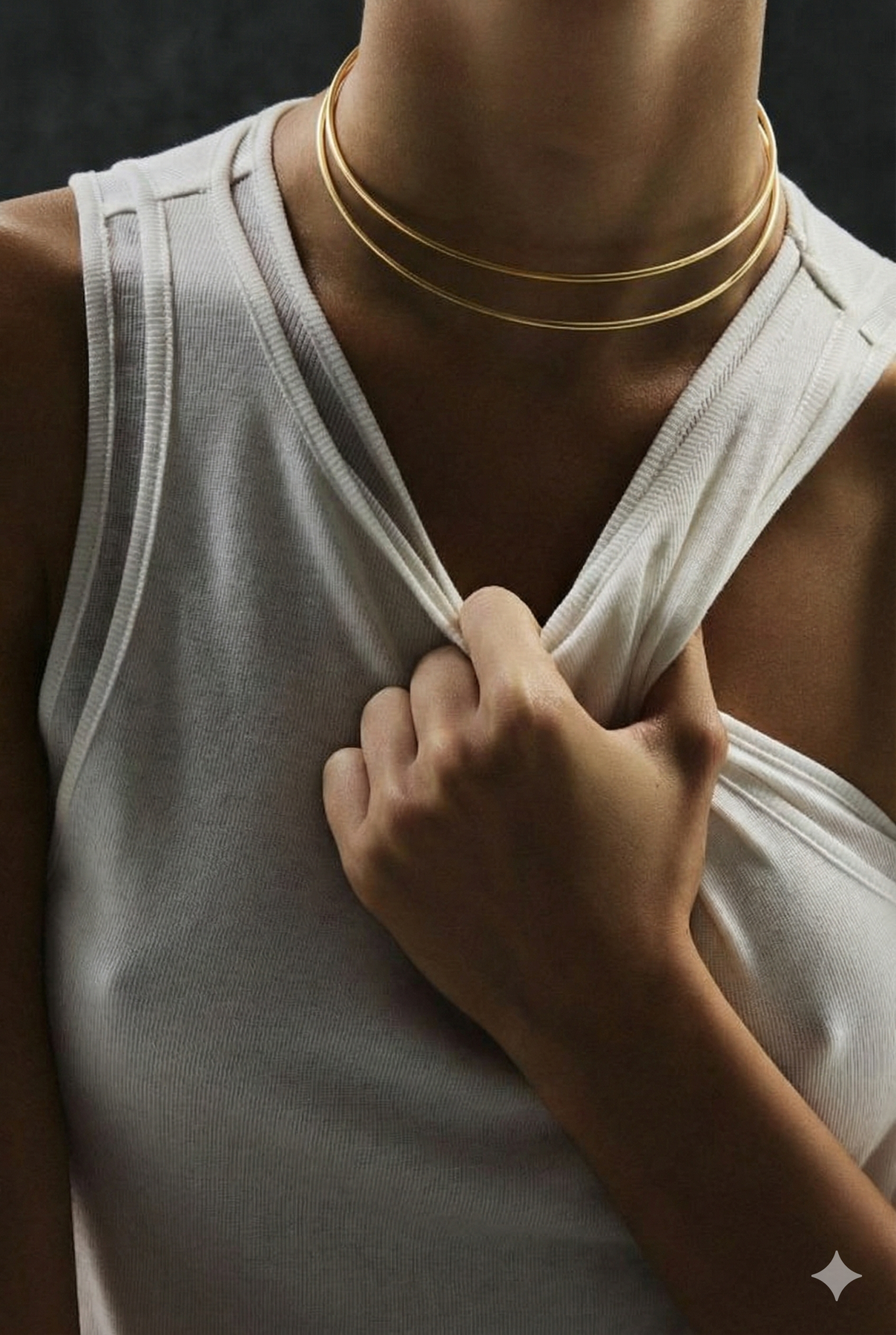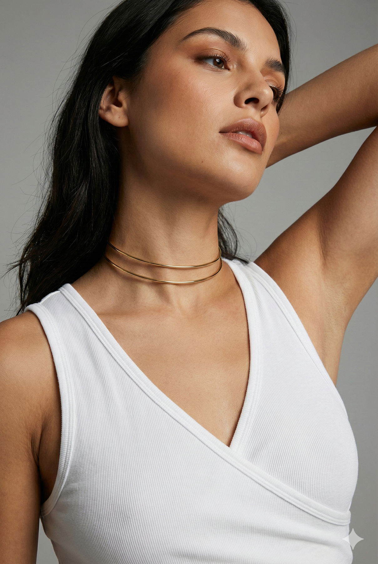 Витончене мінімалістичне намисто із золотистим покриттям. Дві тонкі лінії утворюють елегантну форму, що делікатно огортає шию та підкреслює лінію декольте. Легке, витончене й універсальне — пасує як до повсякденних, так і святкових образів.