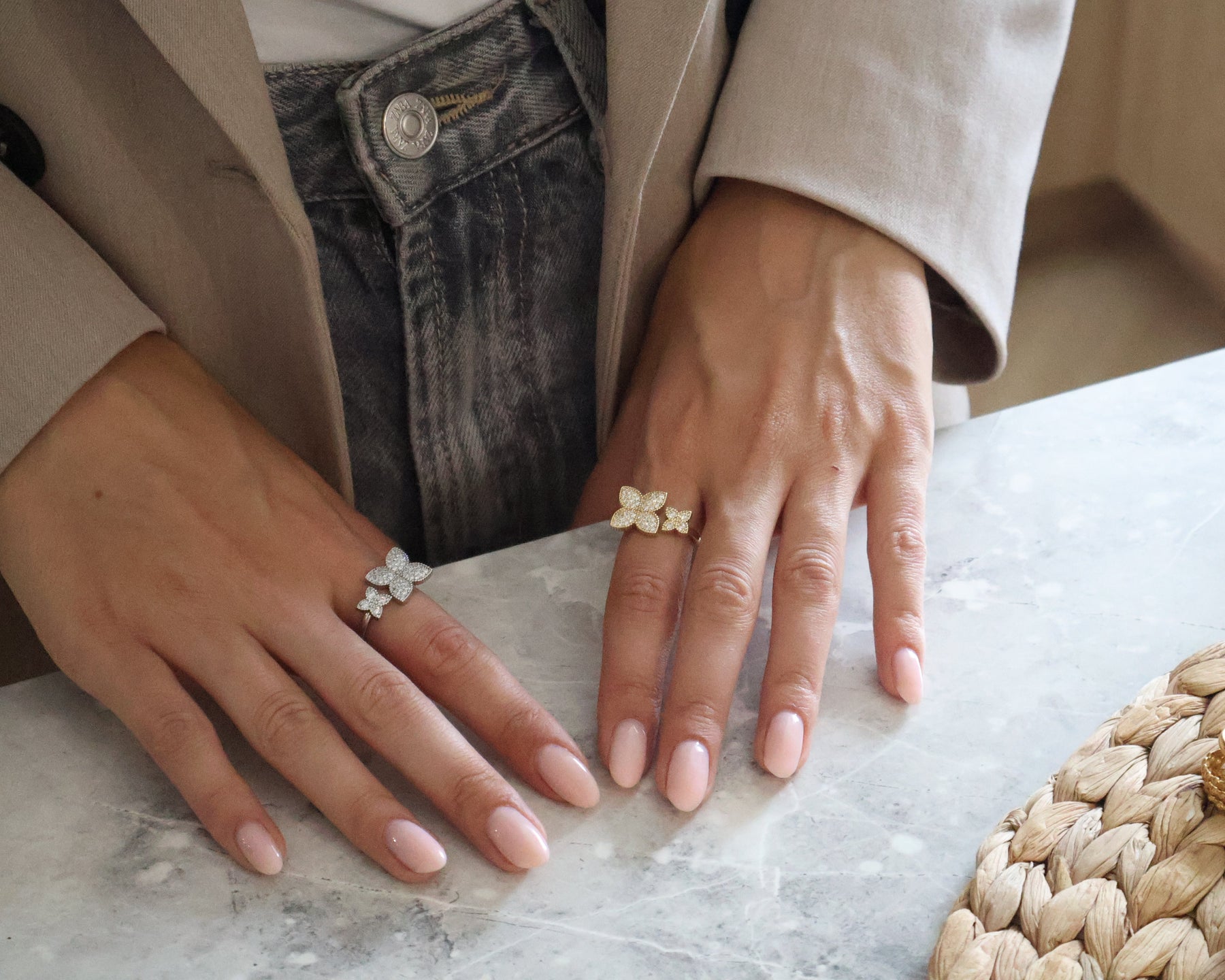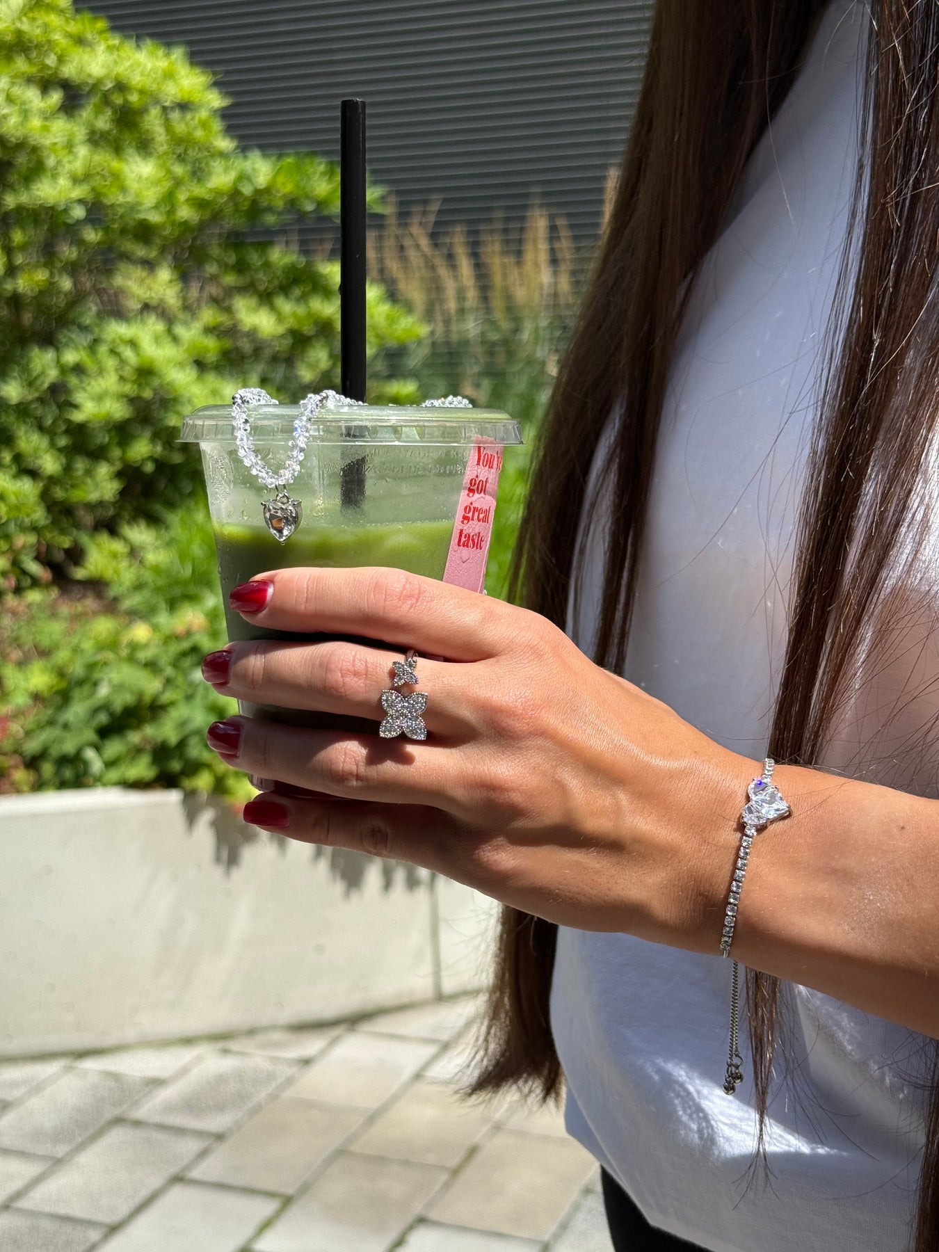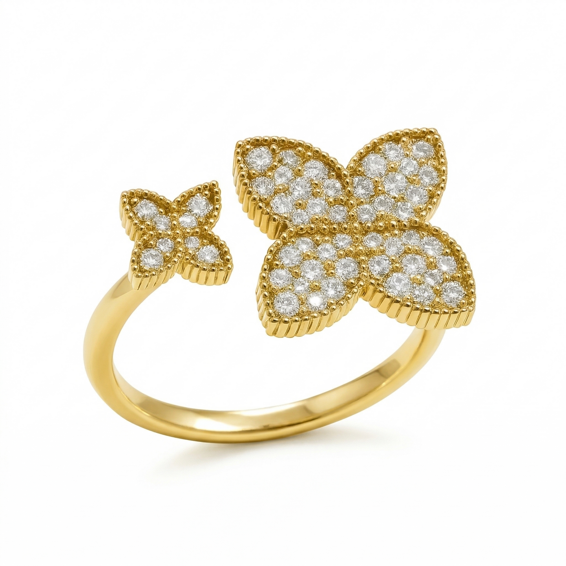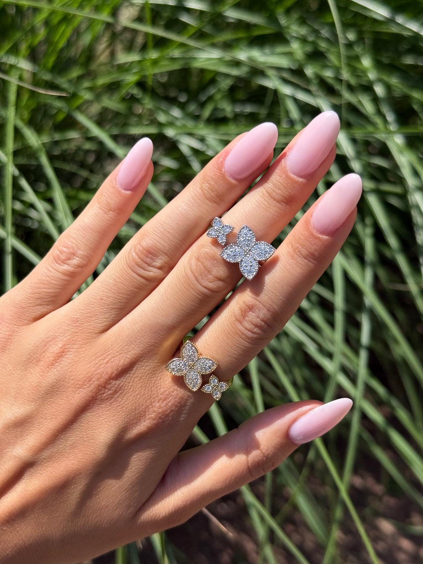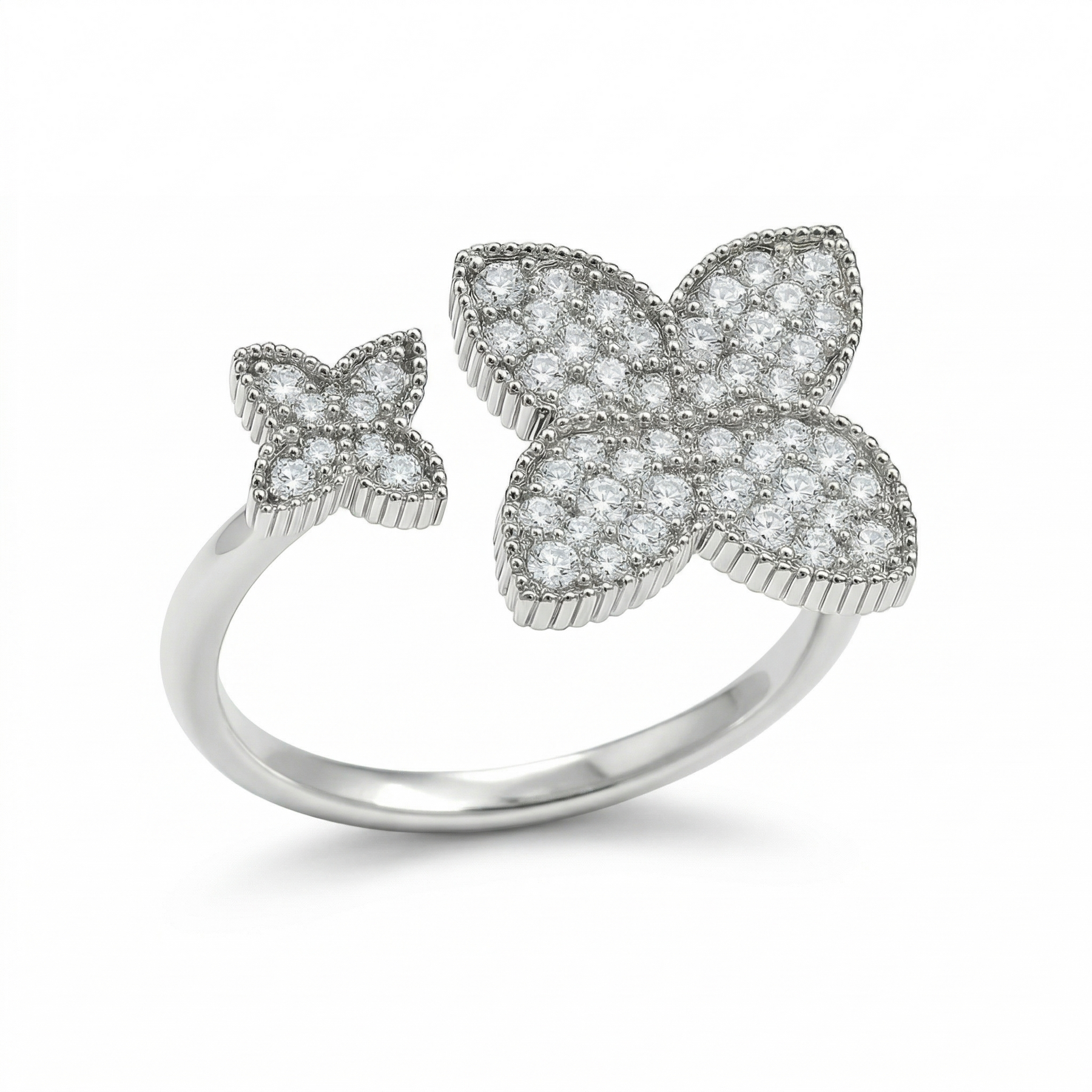 Вишукана каблучка з двома квітками, розміщеними асиметрично, створює ефект легкості та динаміки. Дрібне мерехтіння інкрустації підсилює відчуття розкоші, зберігаючи при цьому ніжність дизайну. Підійде як для щоденного носіння, так і для особливих подій.