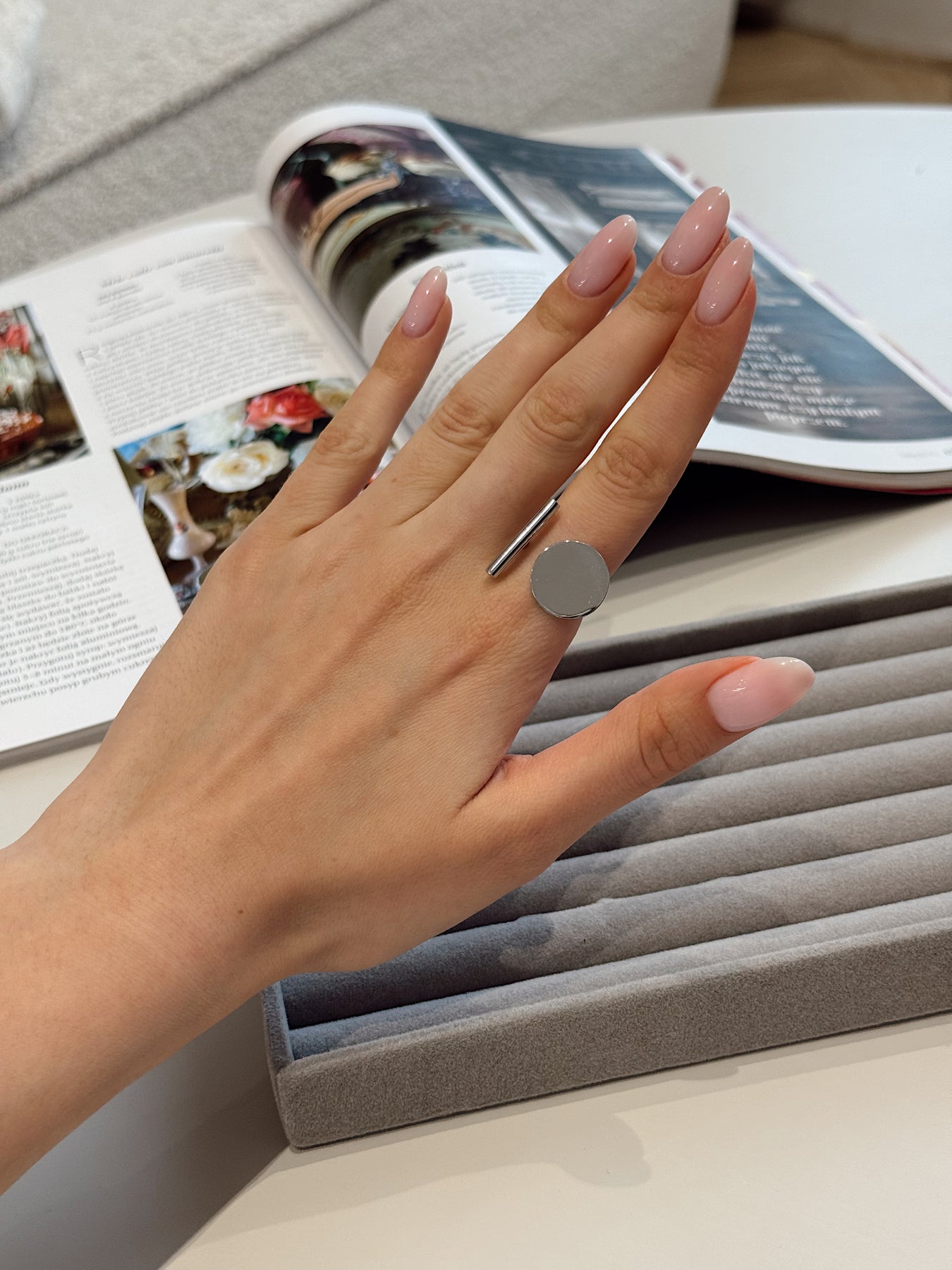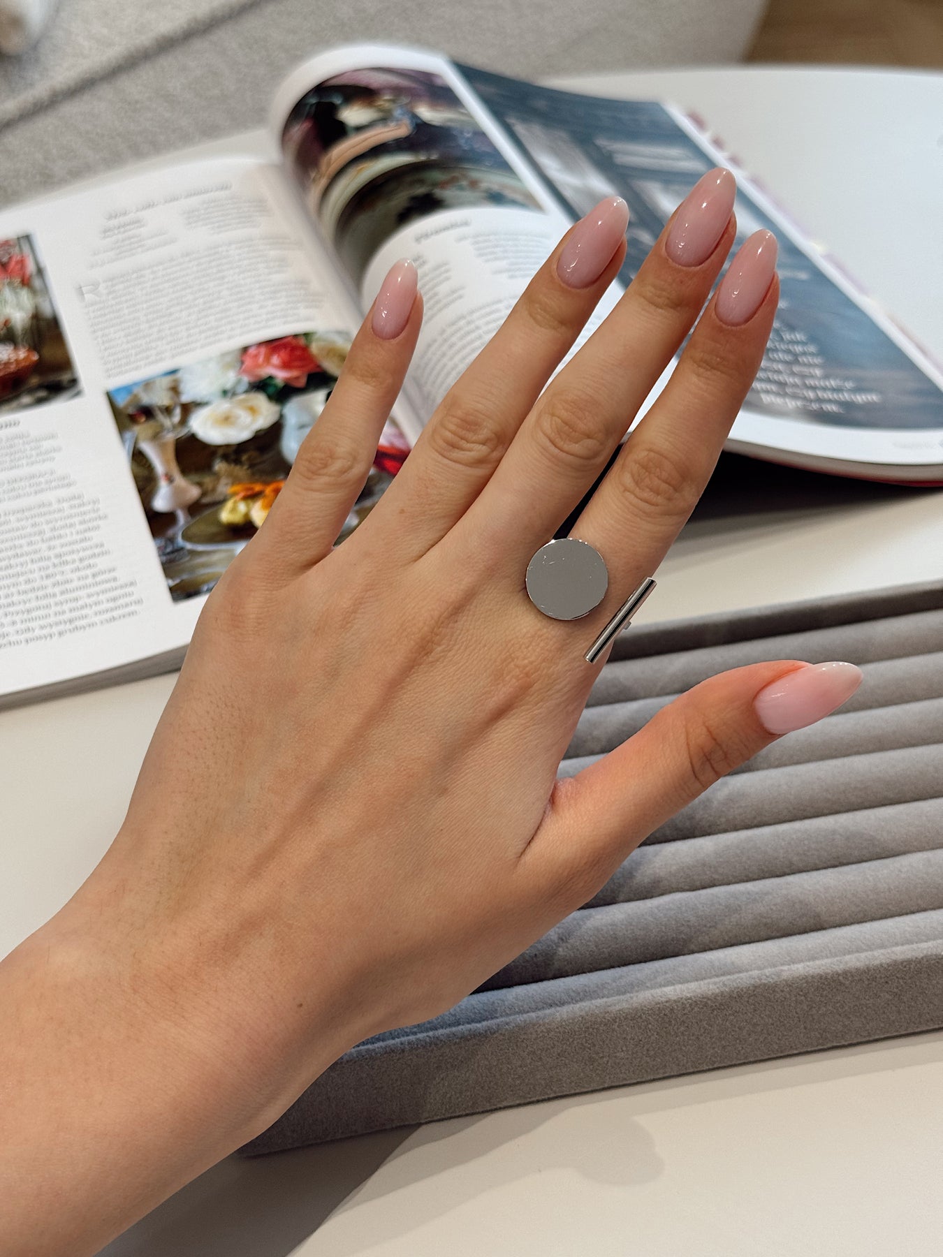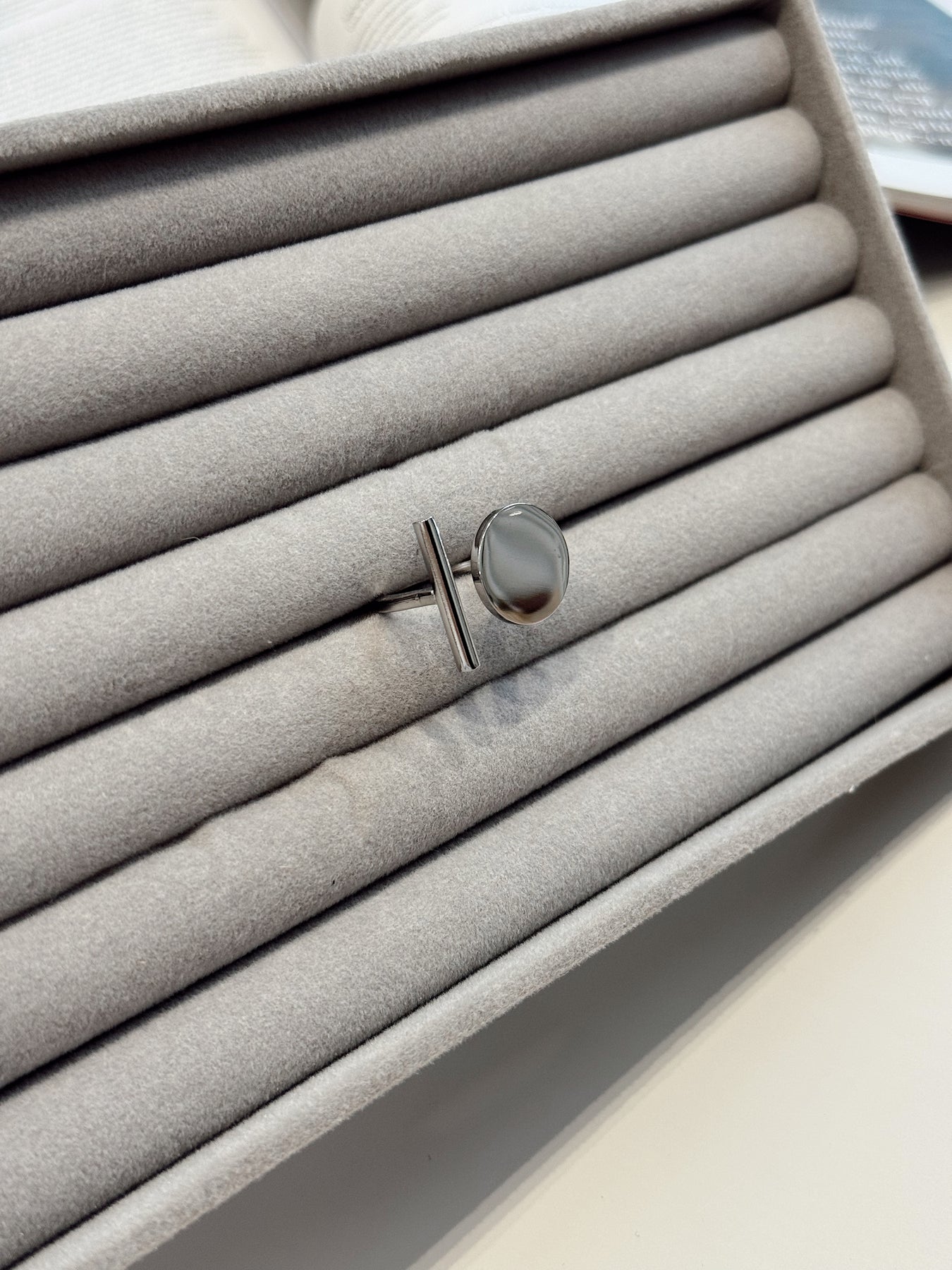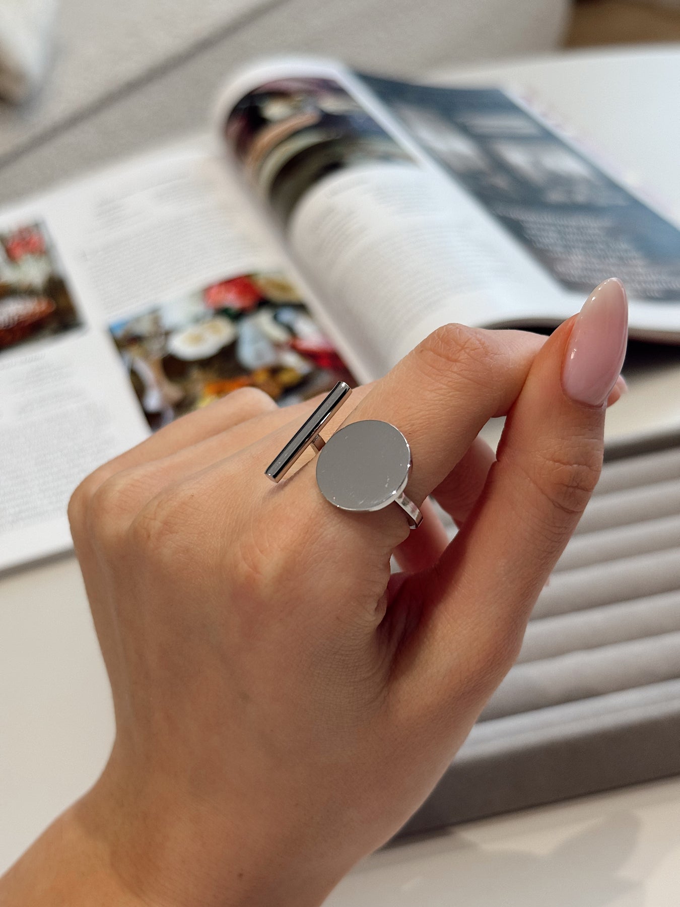 Сучасна каблучка з виразним геометричним характером, яка виглядає як дизайнерський арт-обʼєкт. Контраст двох форм — гладкого круглого елемента та лаконічної вертикальної лінії — створює сміливу, але збалансовану композицію. Дзеркальна поверхня підсилює відчуття мінімалістичної розкоші й робить каблучку яскравим акцентом образу.