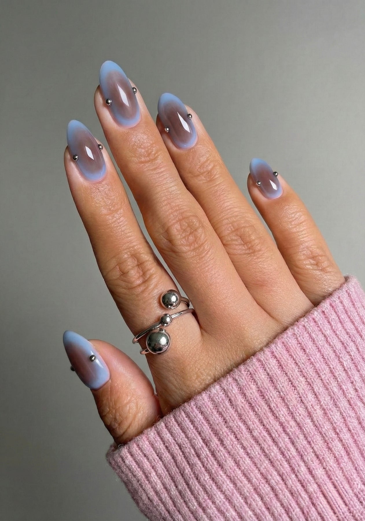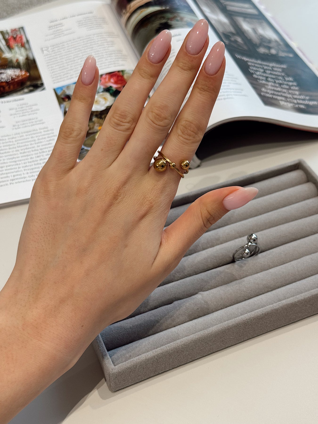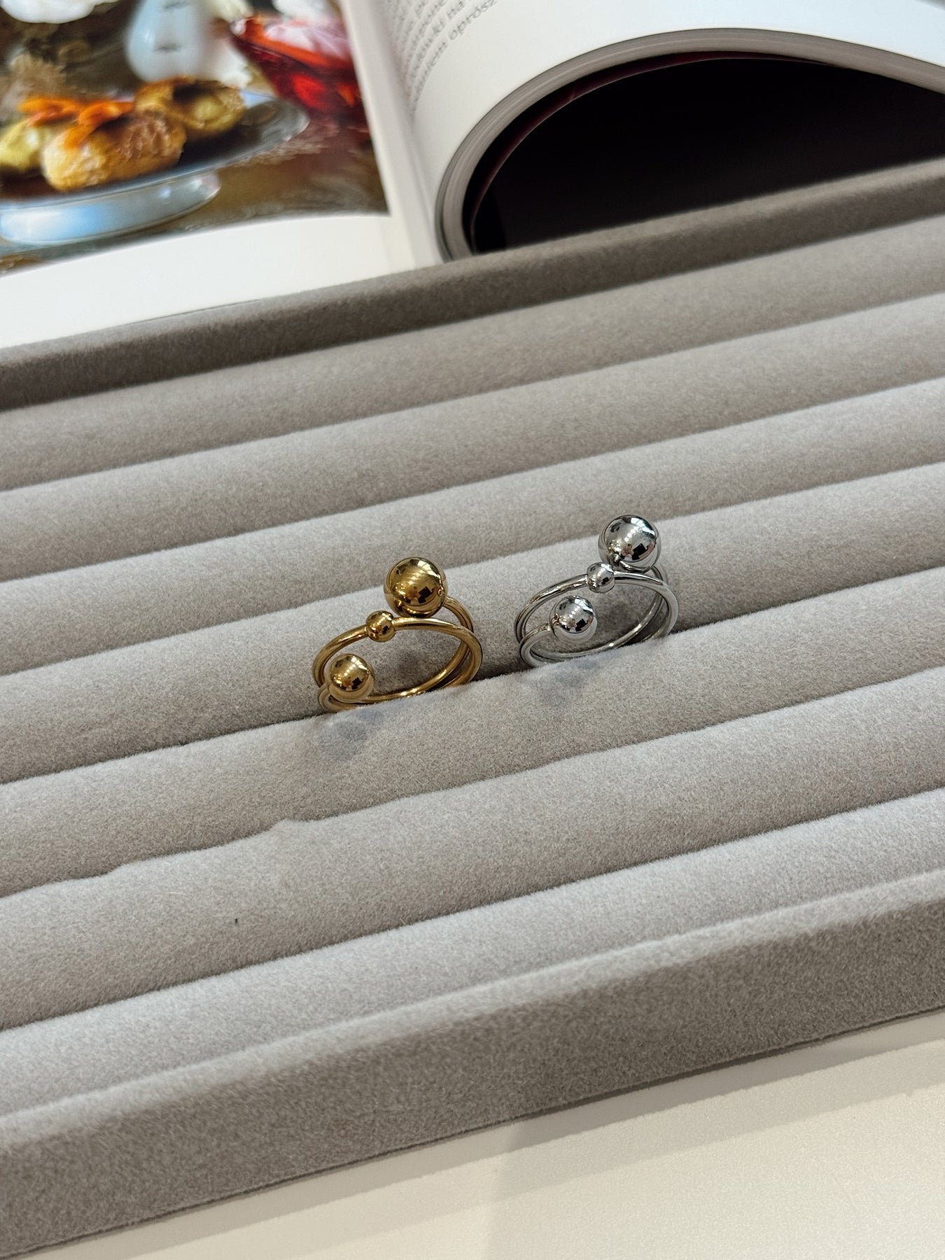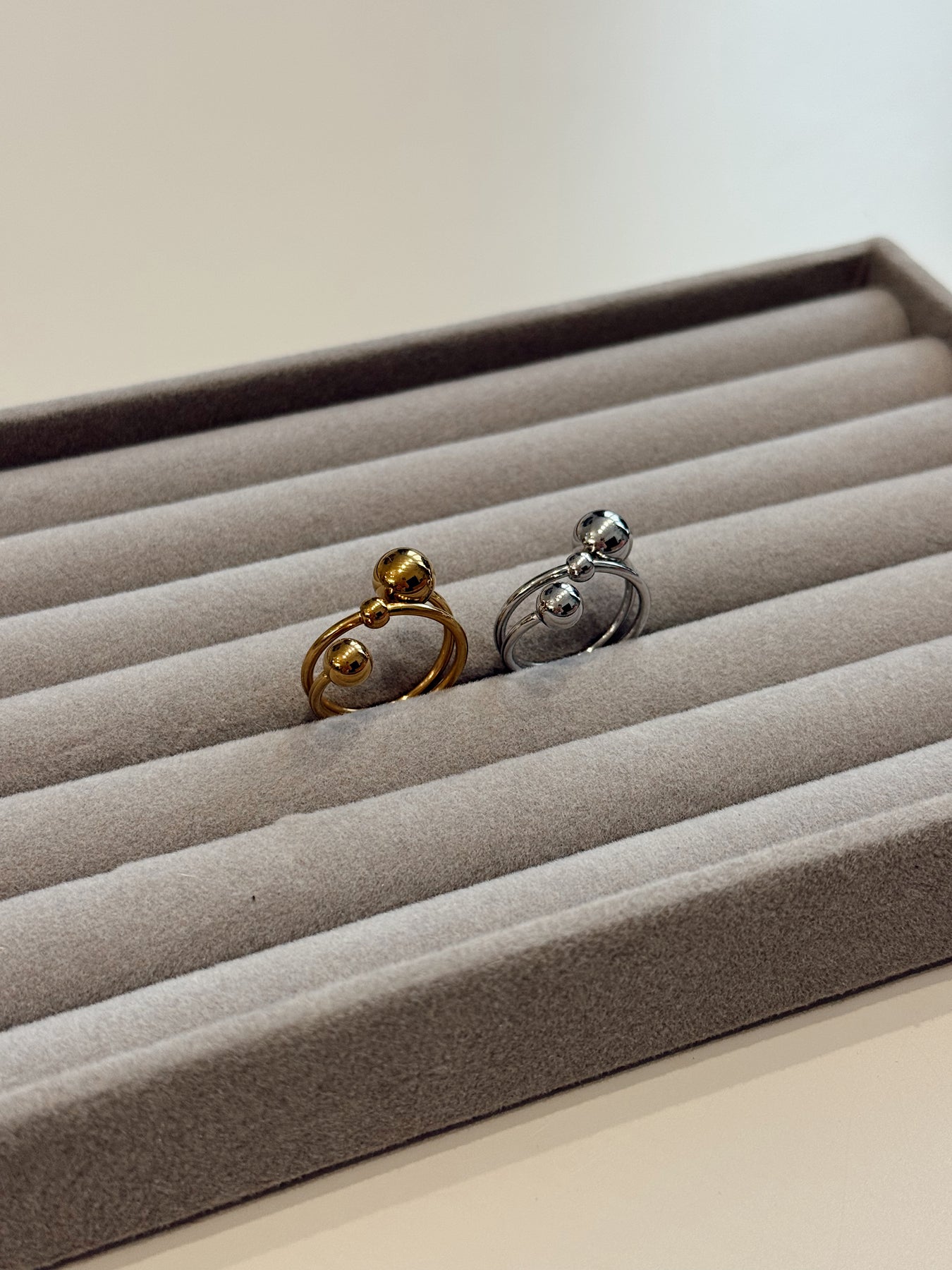 Сучасна акцентна каблучка з чітким, продуманим дизайном. Подвійна лінія основи створює відчуття обʼєму й балансу, а гладкі кульки різного розміру виступають як скульптурний декоративний елемент. Завдяки фіксованому розташуванню кульок каблучка виглядає цілісно, лаконічно та дуже впевнено на руці.