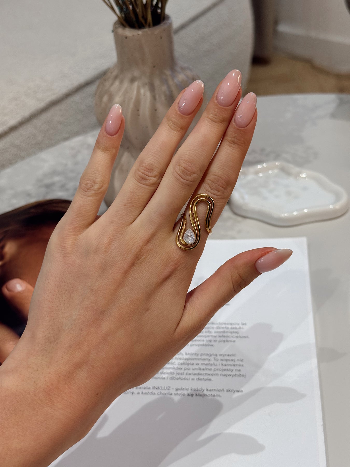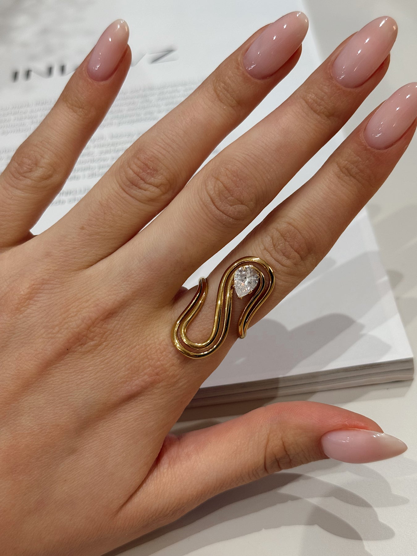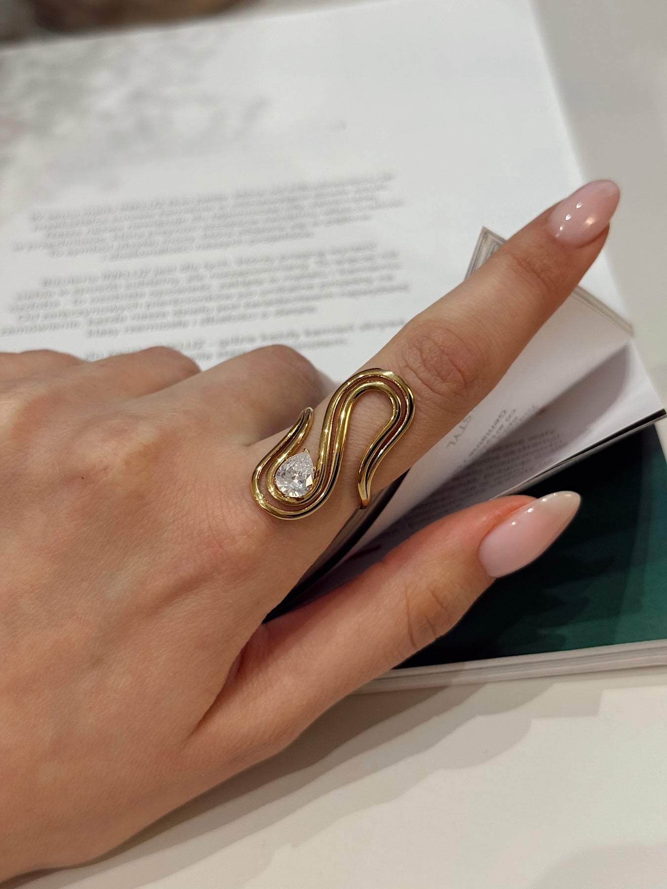 Вишукана золота каблучка з плавними, хвилястими лініями, що огортають прозорий камінь грушоподібної форми. Органічний дизайн створює відчуття руху та легкості, а дзеркальне покриття надає прикрасі витонченого блиску. Завдяки відкритій основі розмір легко регулюється, забезпечуючи комфортну посадку.