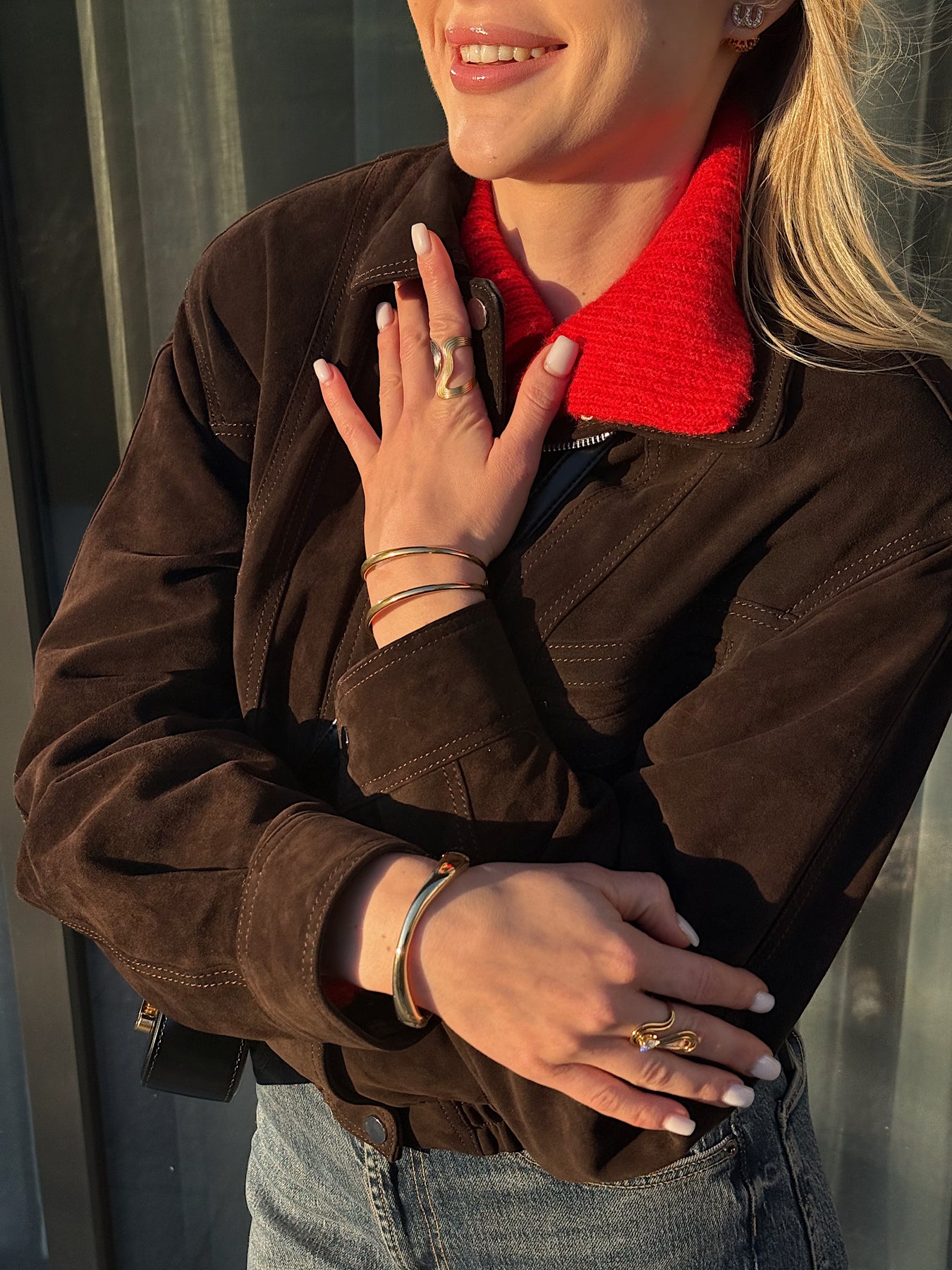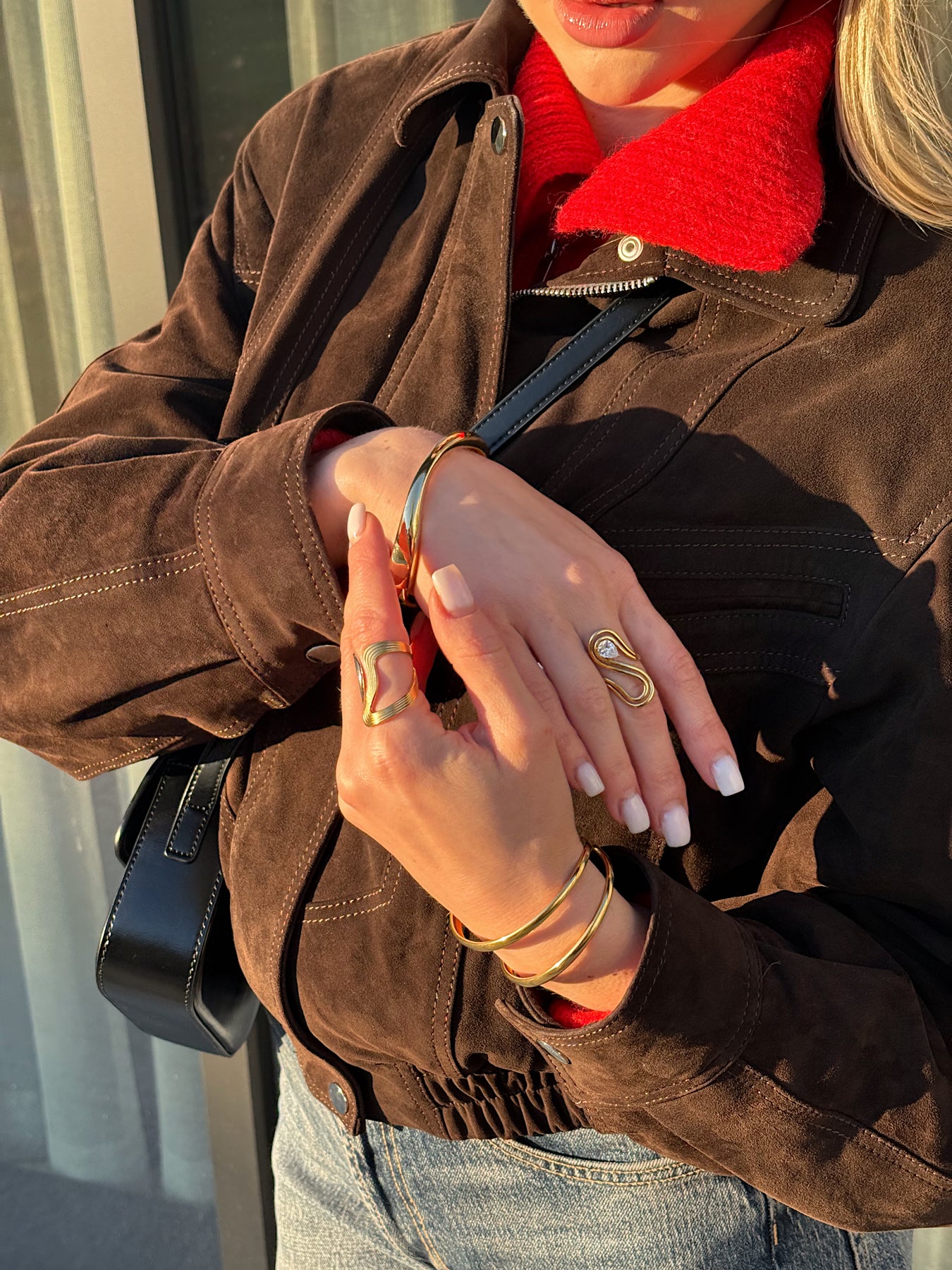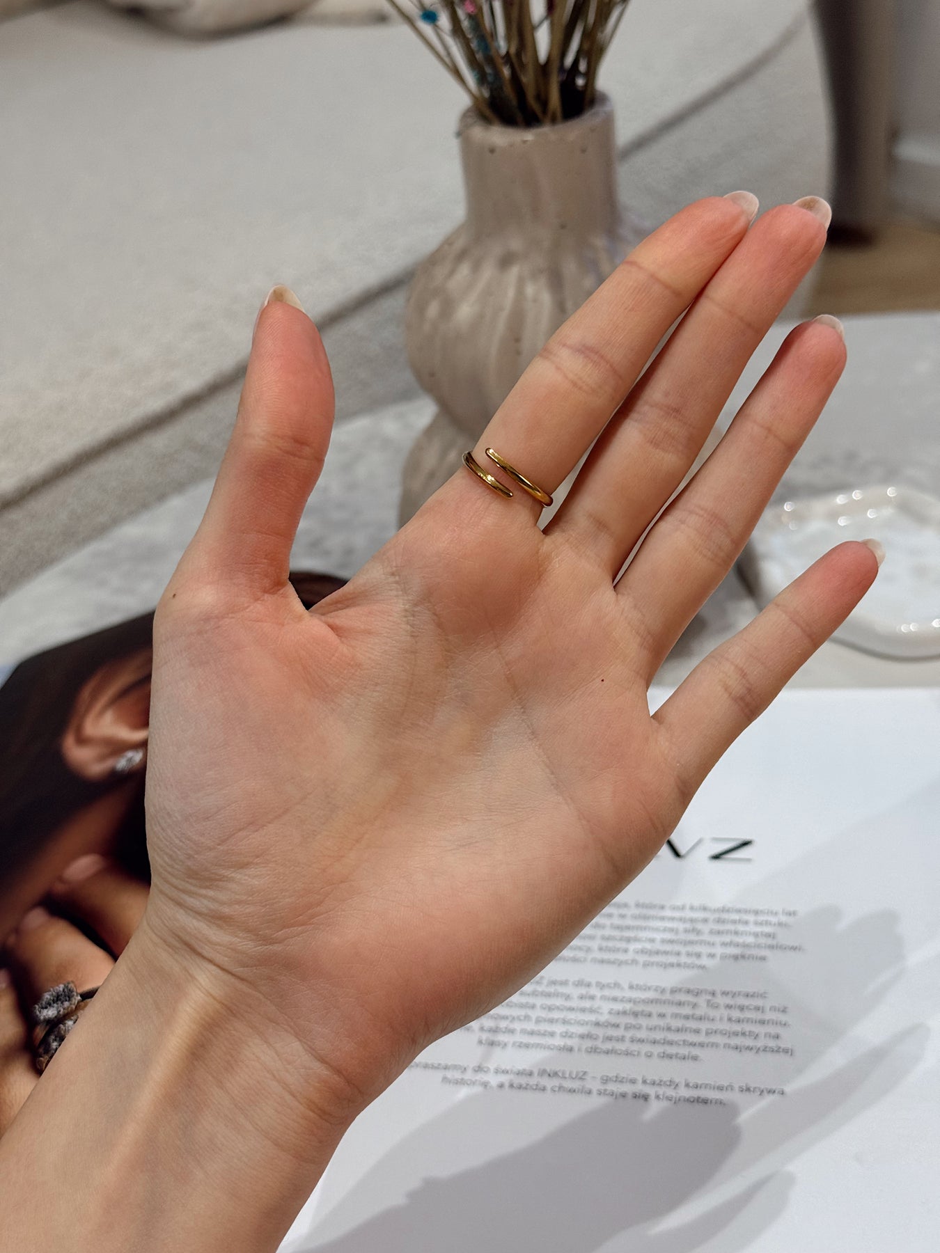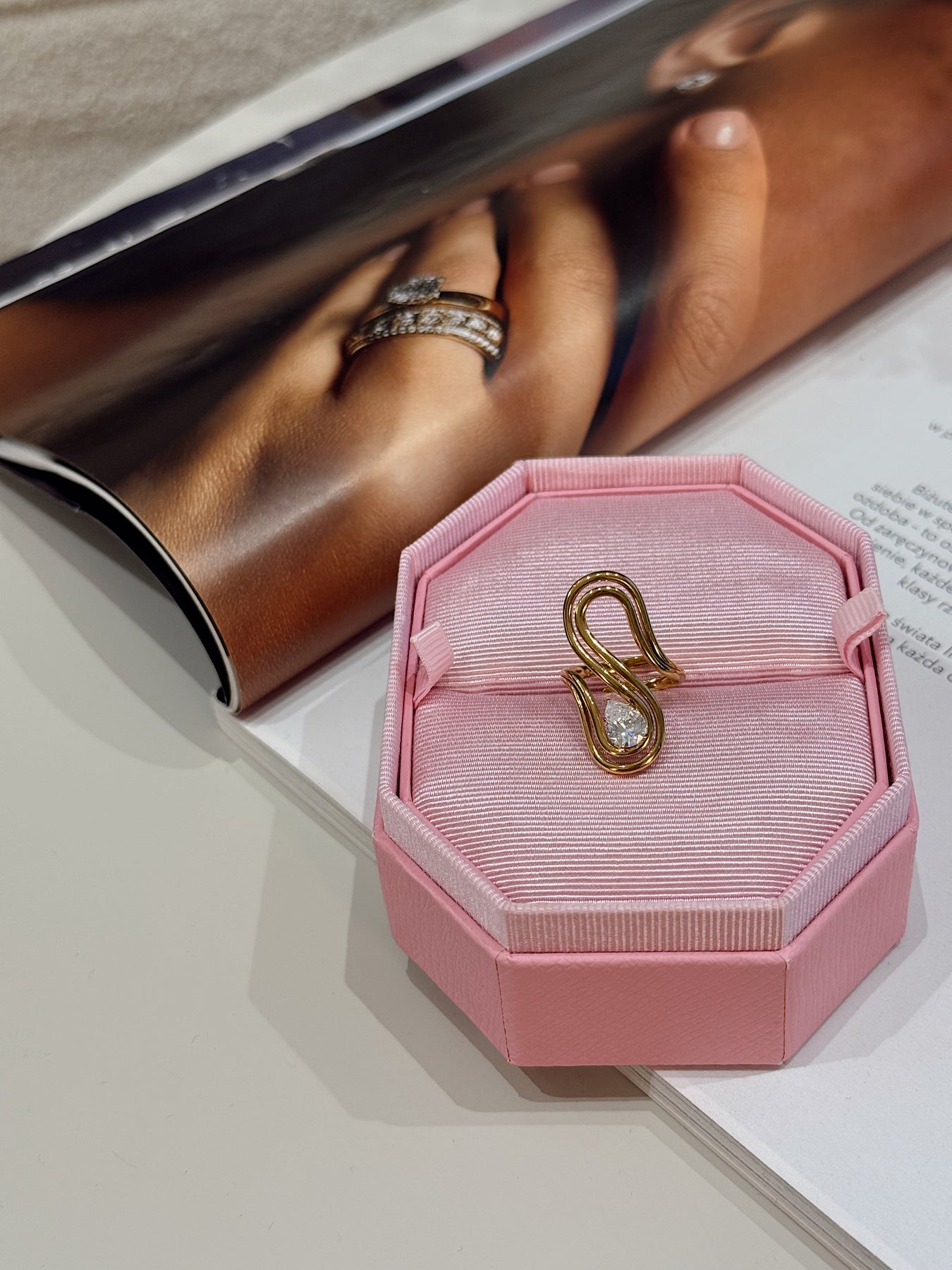 Вишукана золота каблучка з плавними, хвилястими лініями, що огортають прозорий камінь грушоподібної форми. Органічний дизайн створює відчуття руху та легкості, а дзеркальне покриття надає прикрасі витонченого блиску. Завдяки відкритій основі розмір легко регулюється, забезпечуючи комфортну посадку.