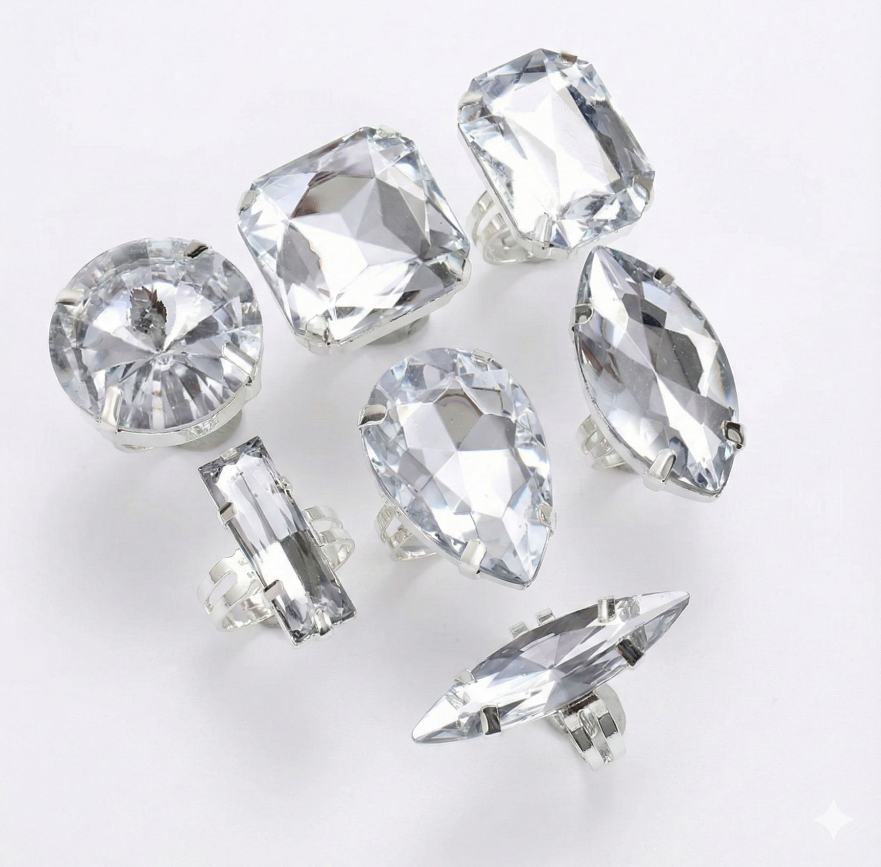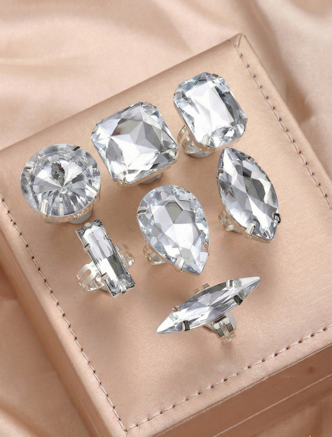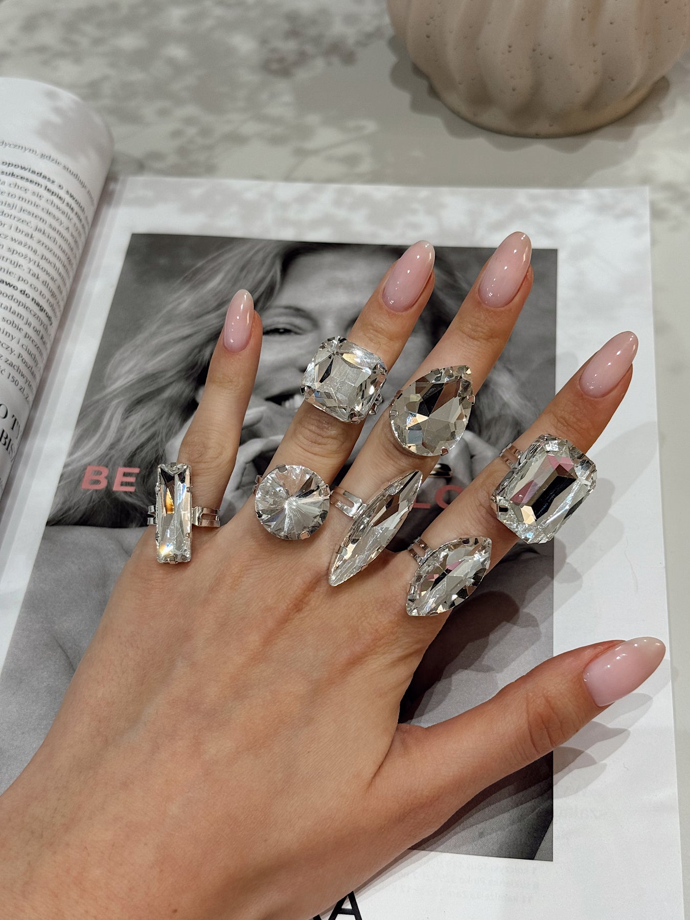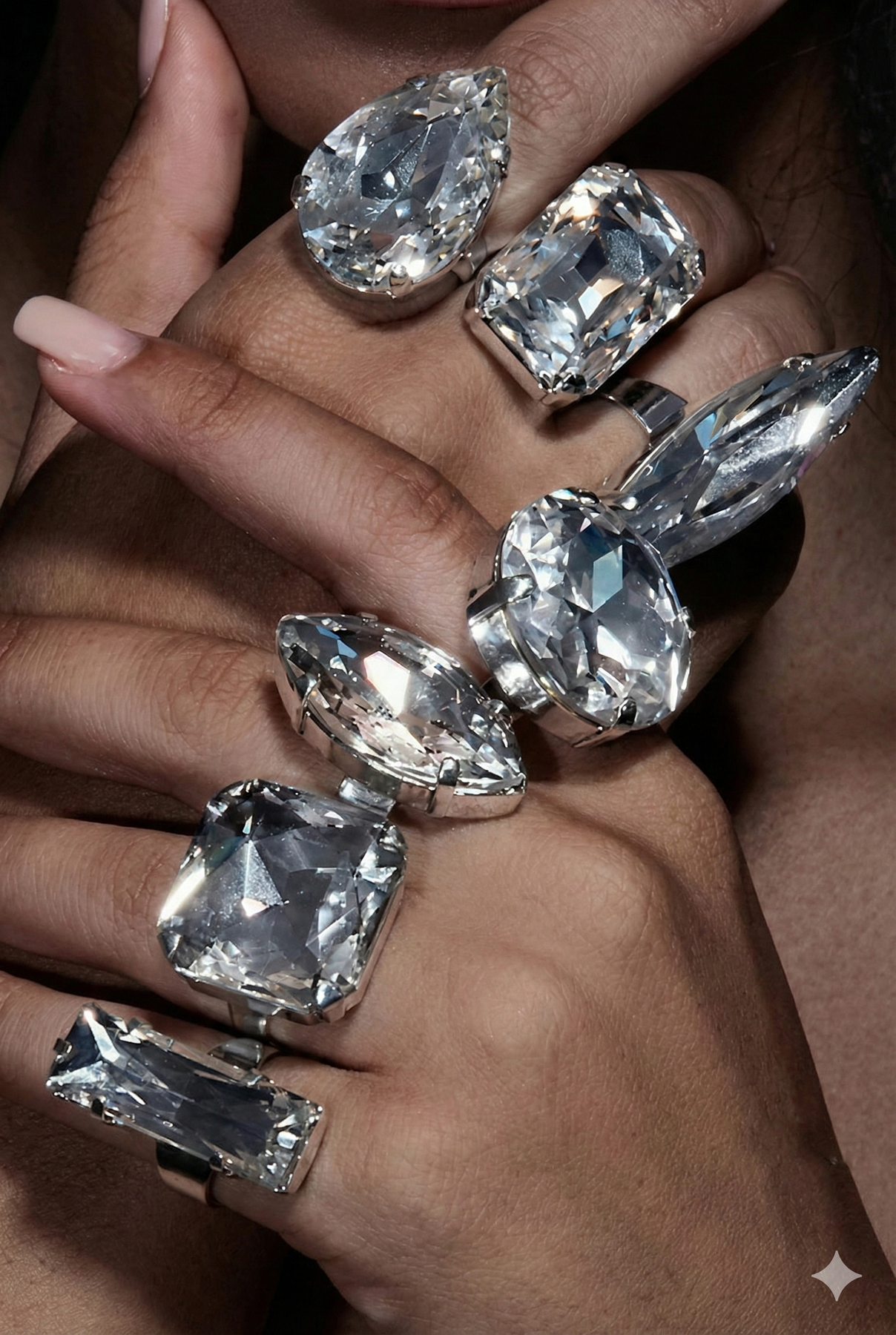 Ці каблучки — чистий fashion-statement. Великі прозорі кристали різних форм зараз на піку трендів: їх носять соло, міксують між собою або поєднують з мінімалістичними образами, щоб зробити акцент. Вони виглядають як прикраса з подіумів — сміливо, впевнено, сучасно.