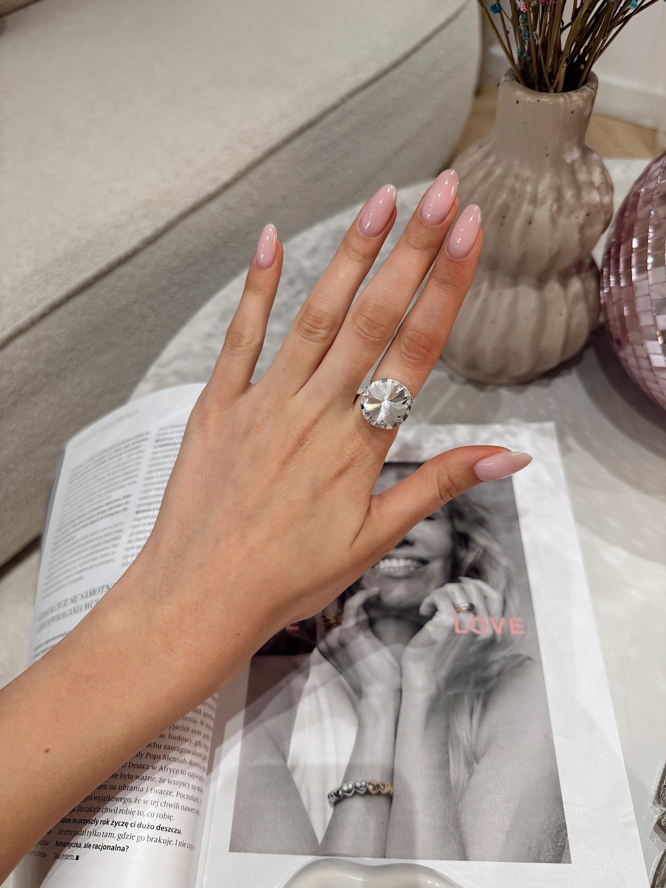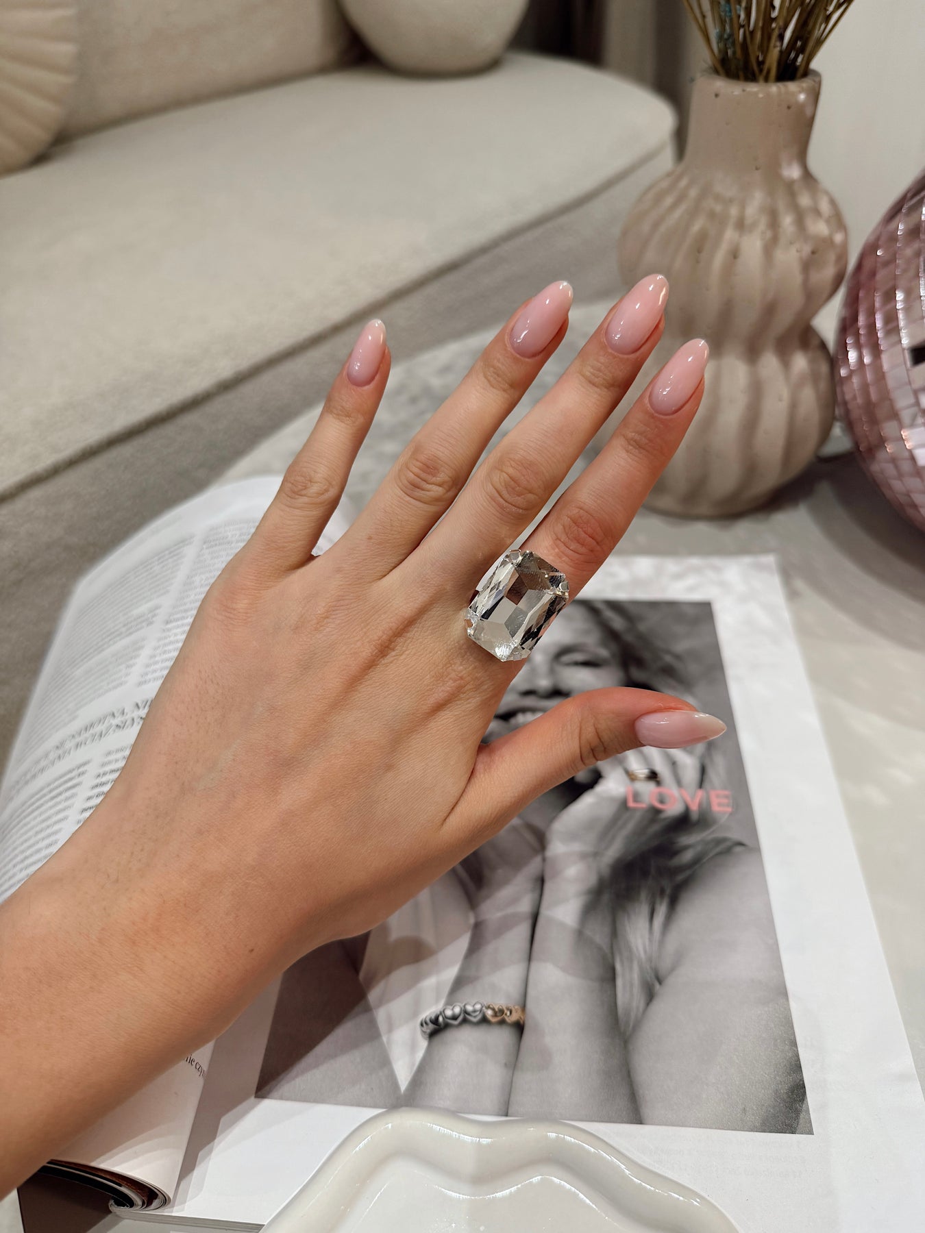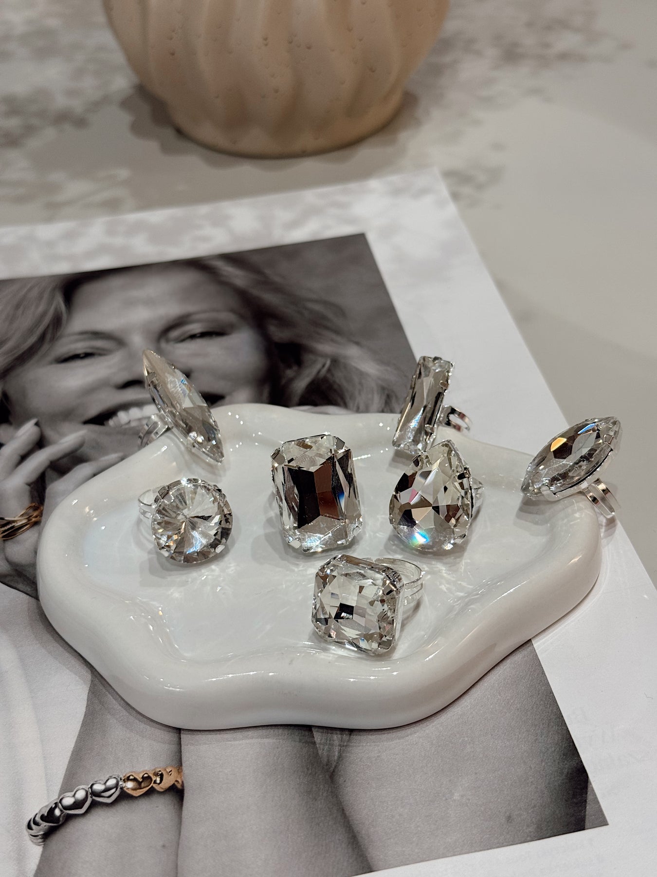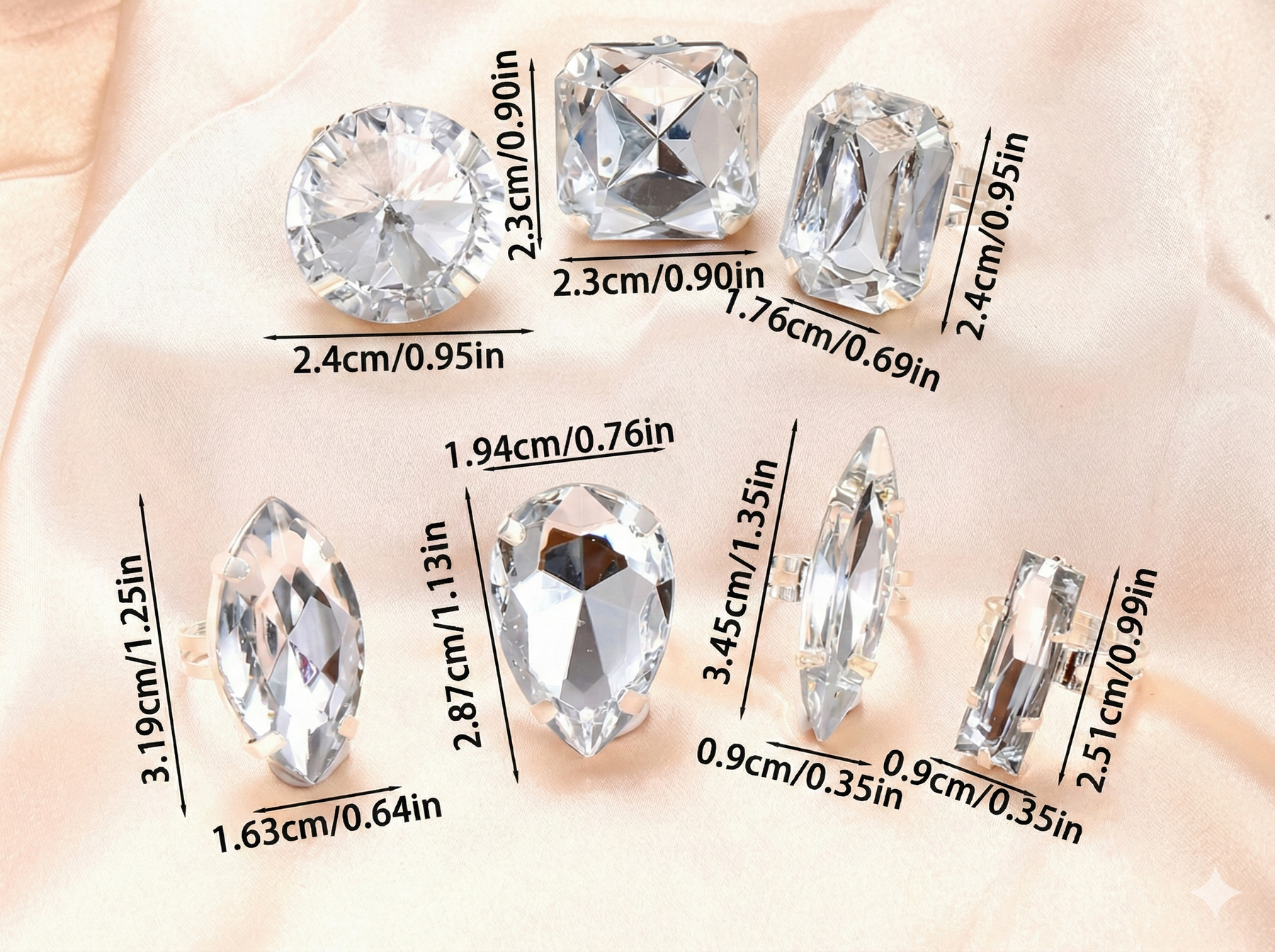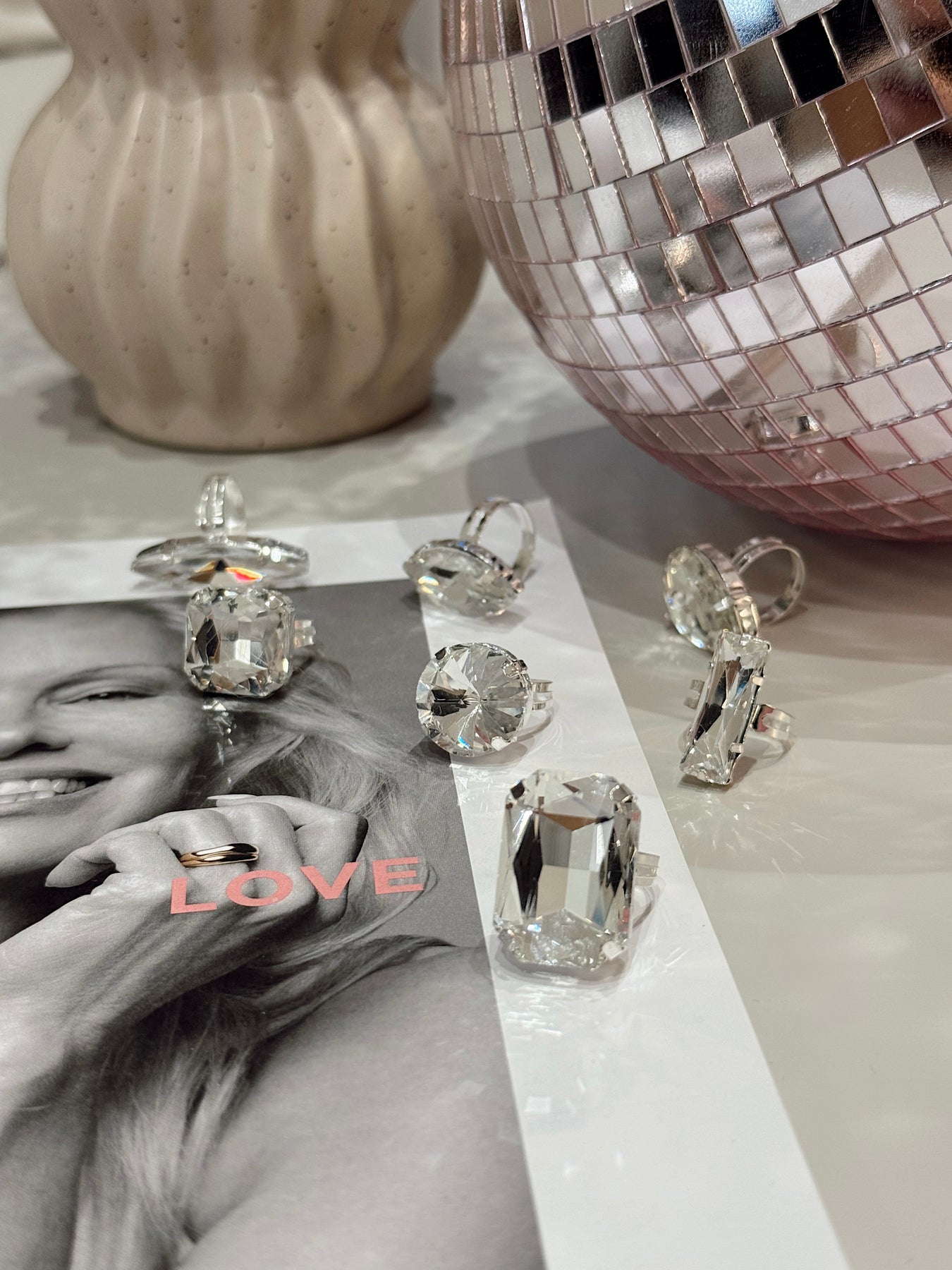 Ці каблучки — чистий fashion-statement. Великі прозорі кристали різних форм зараз на піку трендів: їх носять соло, міксують між собою або поєднують з мінімалістичними образами, щоб зробити акцент. Вони виглядають як прикраса з подіумів — сміливо, впевнено, сучасно.
