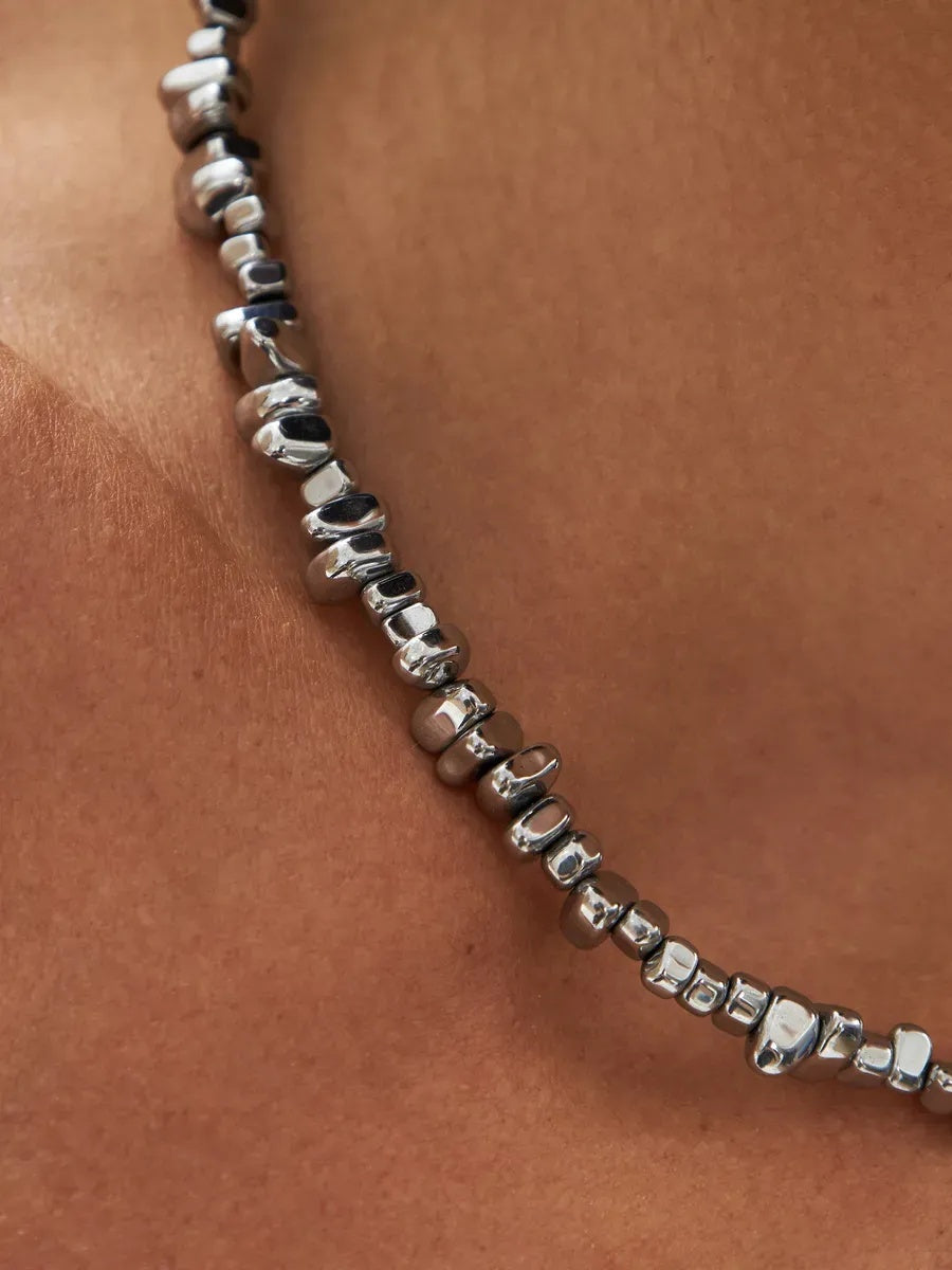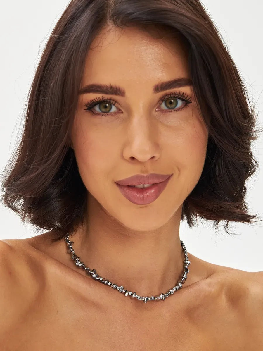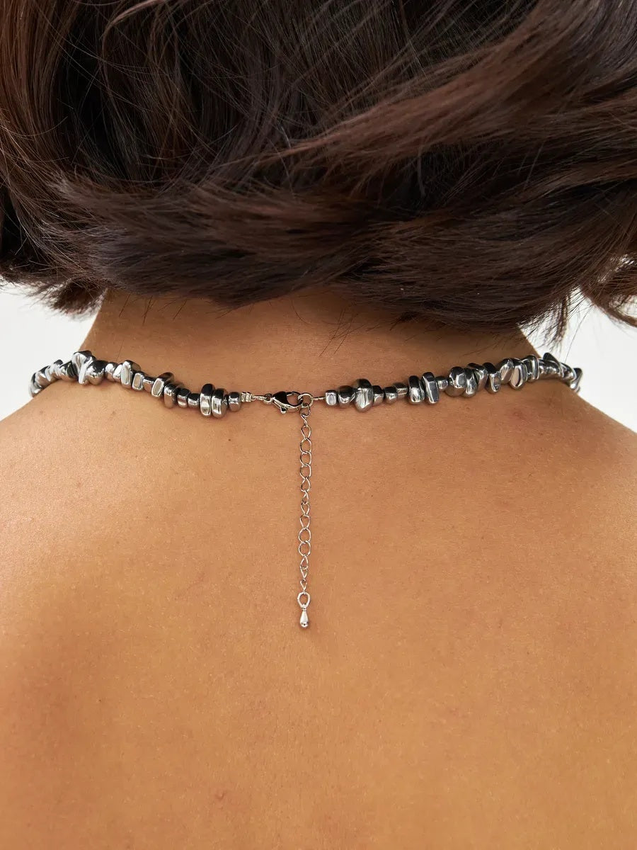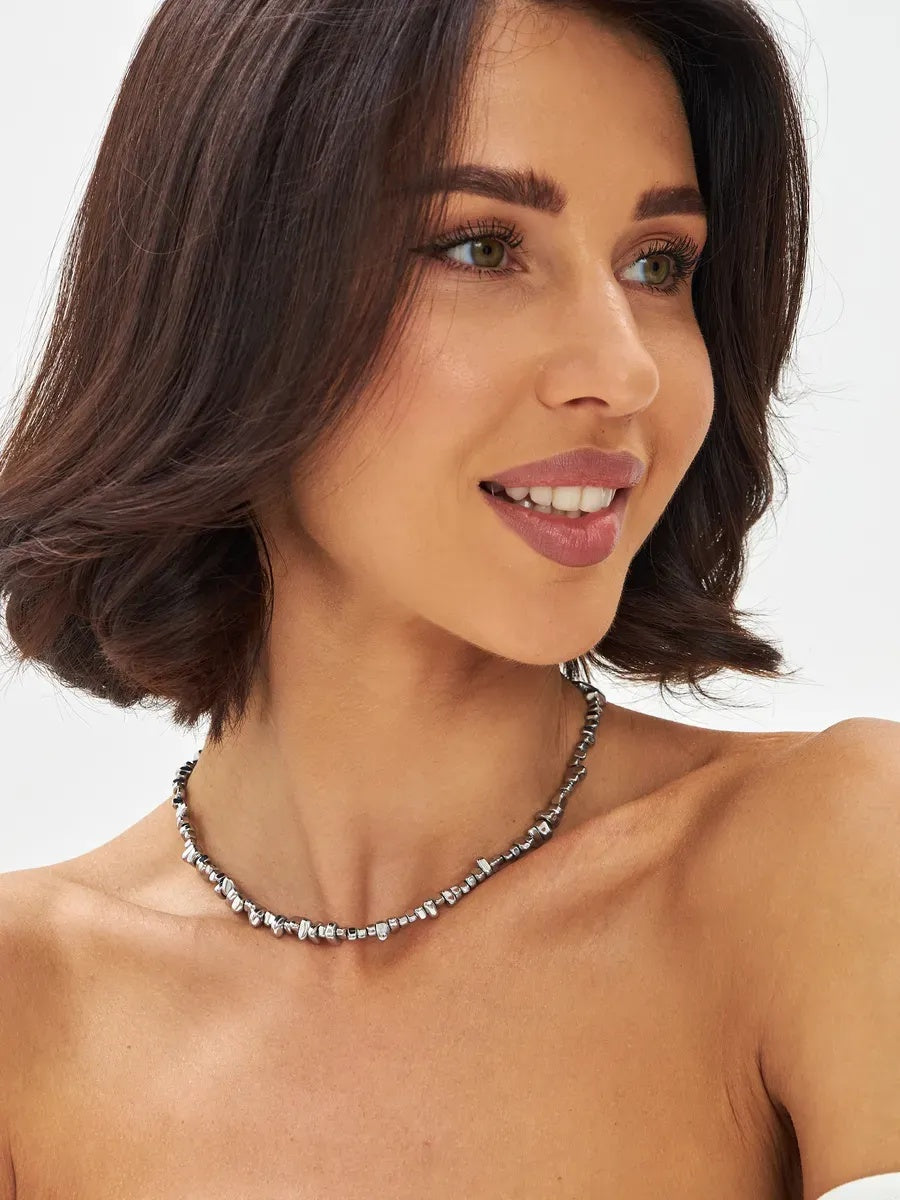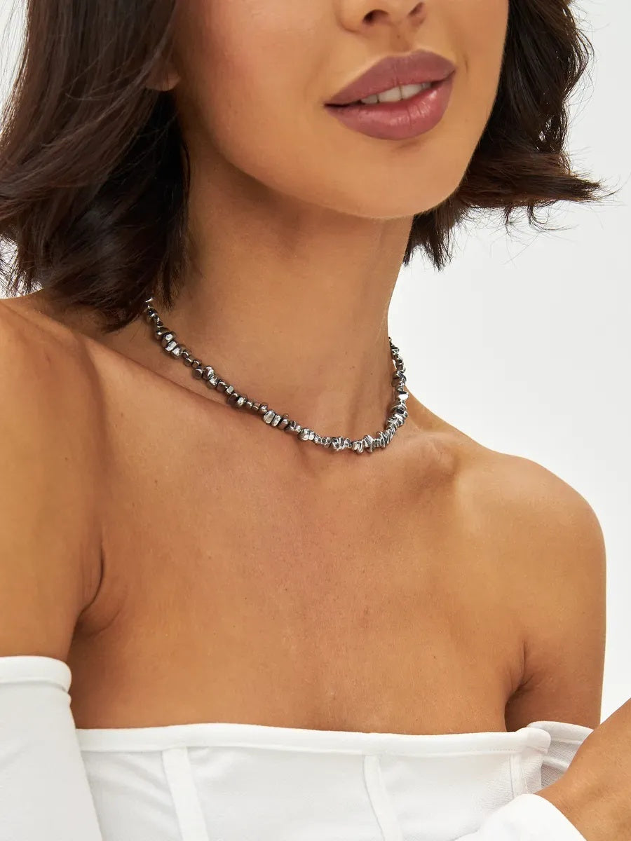 Лаконічне, виразне, ідеально вивірене намисто, що підходить і для стриманих образів, і для акцентних комбінацій. Незвичні металеві елементи створюють текстуру й ритм, який приваблює погляд без зайвого блиску.