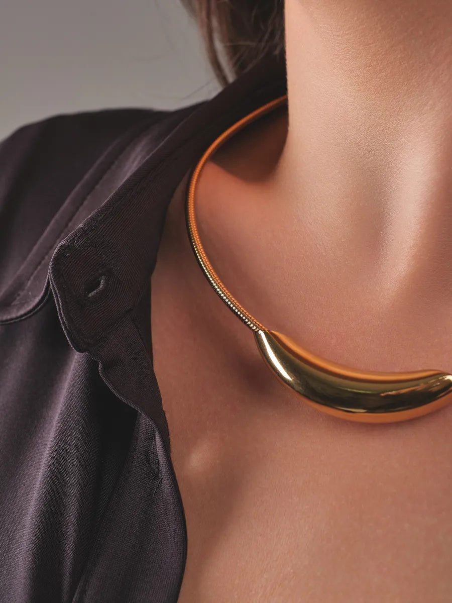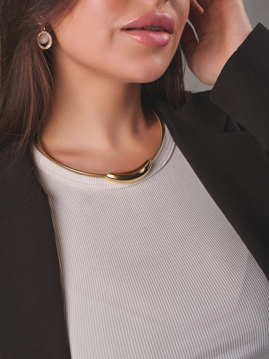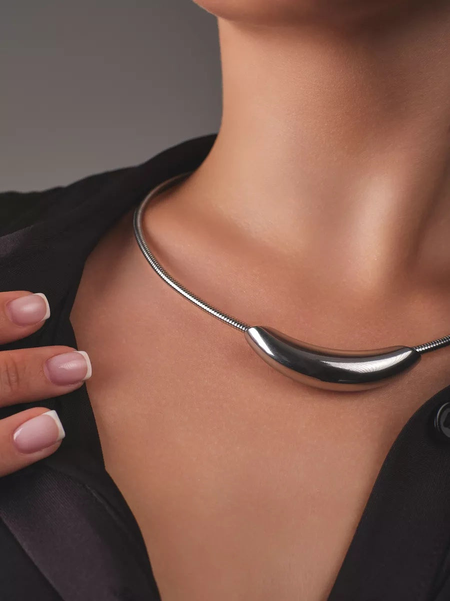 Сучасна класика, яка не потребує зайвих деталей. Кольє з гладкою геометричною формою щільно лягає по шиї, підкреслюючи лінію декольте. Завдяки магнітній застібці прикраса легко фіксується одним рухом. Ідеальний варіант як для ділового образу, так і для вечірньої зустрічі.