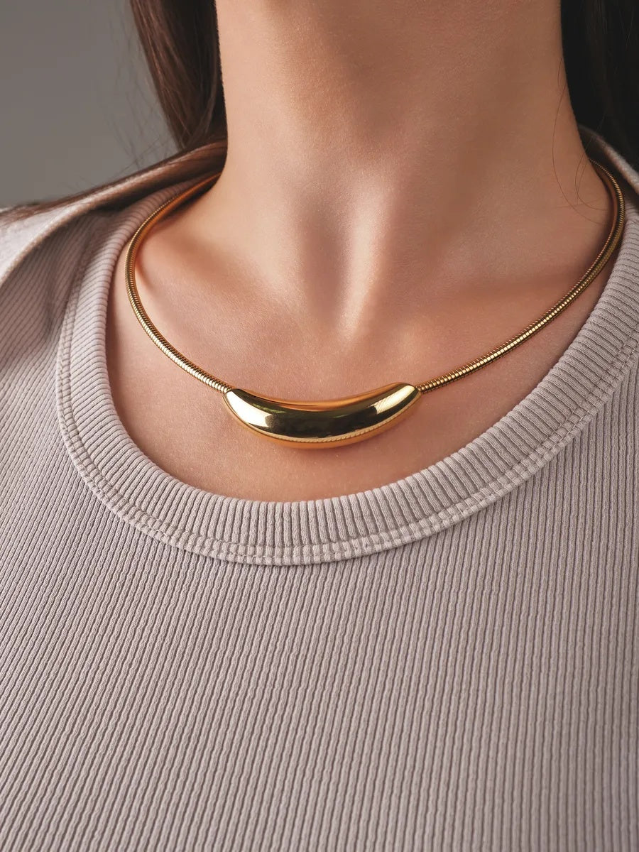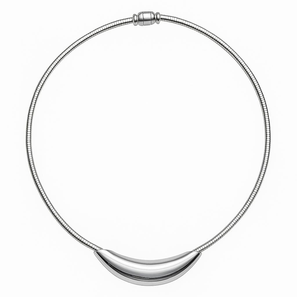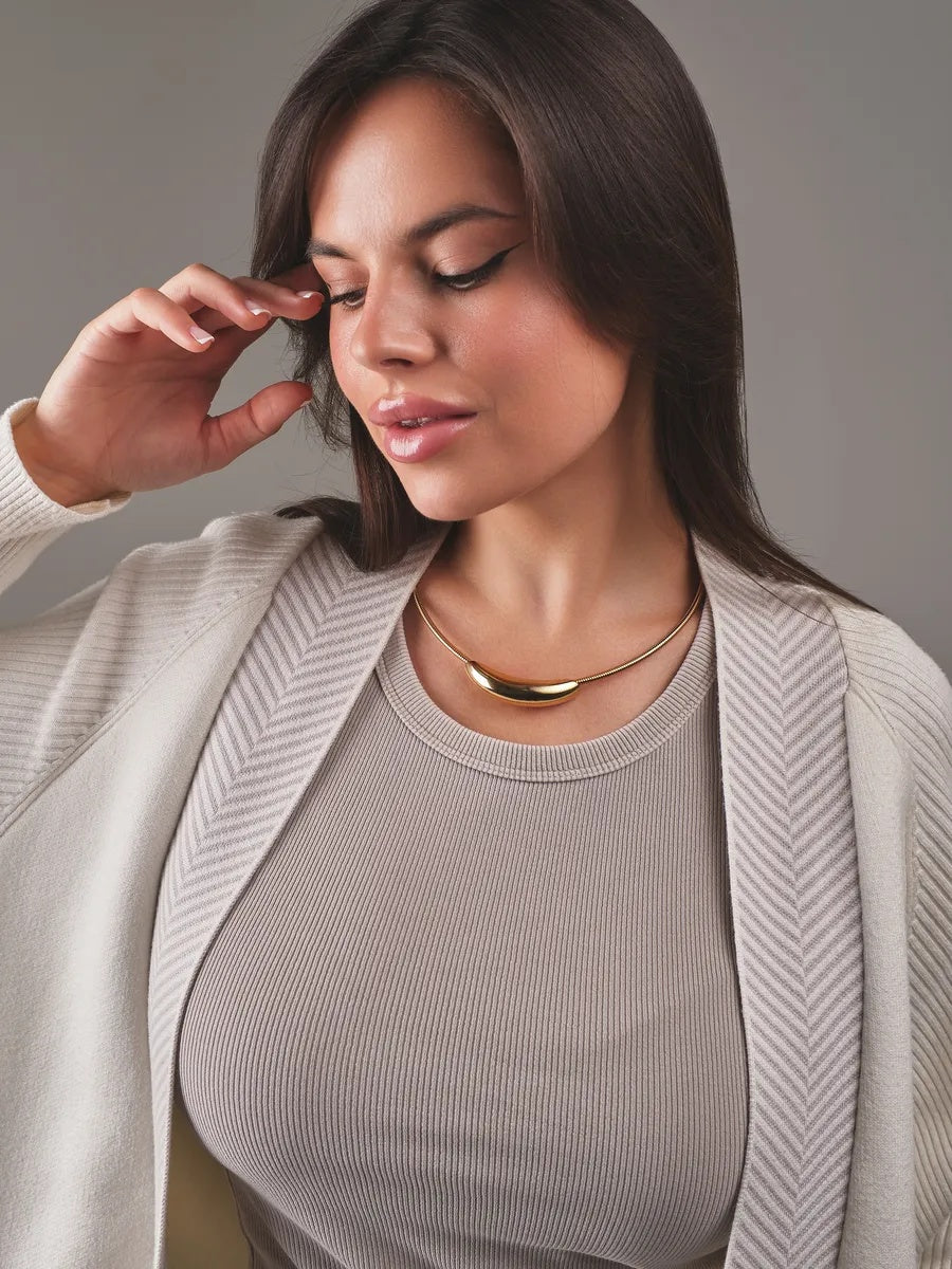 Сучасна класика, яка не потребує зайвих деталей. Кольє з гладкою геометричною формою щільно лягає по шиї, підкреслюючи лінію декольте. Завдяки магнітній застібці прикраса легко фіксується одним рухом. Ідеальний варіант як для ділового образу, так і для вечірньої зустрічі.