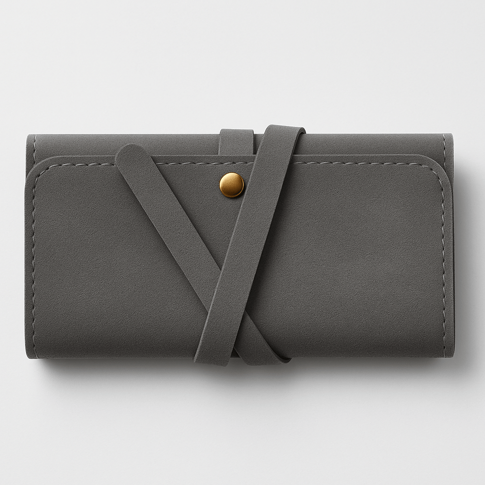Стильний футляр-скрутка надійно захищає ваші прикраси у подорожах і вдома. М’яка фактура та акуратні шви створюють відчуття преміум-якости, а перехресний ремінець дозволяє швидко й безпечно застібнути виріб. Компактний дизайн легко поміщається в сумочку й уберігає аксесуари від подряпин.