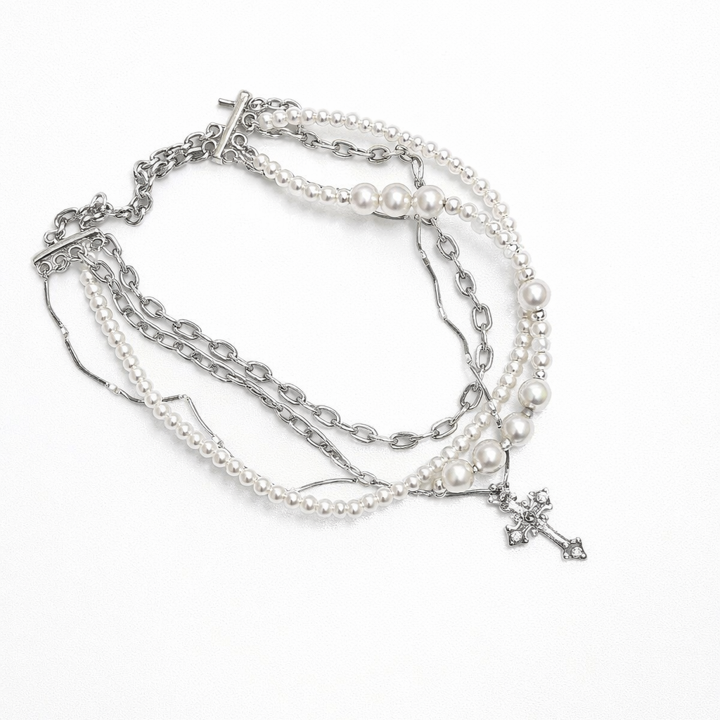 Цей чокер — поєднання ніжності та характеру. Перлини додають м’якості й жіночності, ланцюжок — сучасної впевненості, а підвіска-хрестик стає стильним акцентом, який притягує погляд. Він виглядає багатошаровим і продуманим, ніби зібраний з деталей, кожна з яких має свій настрій.