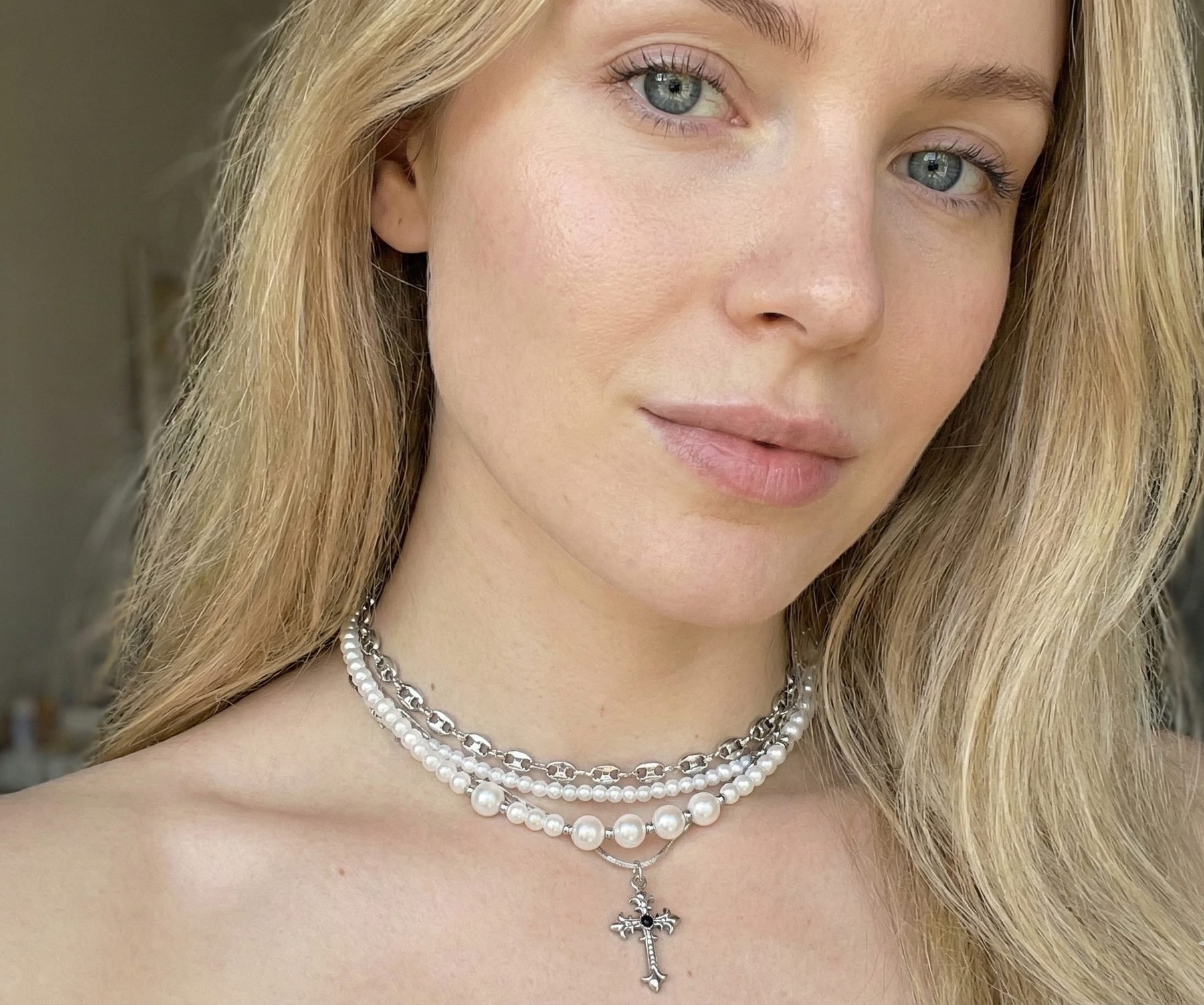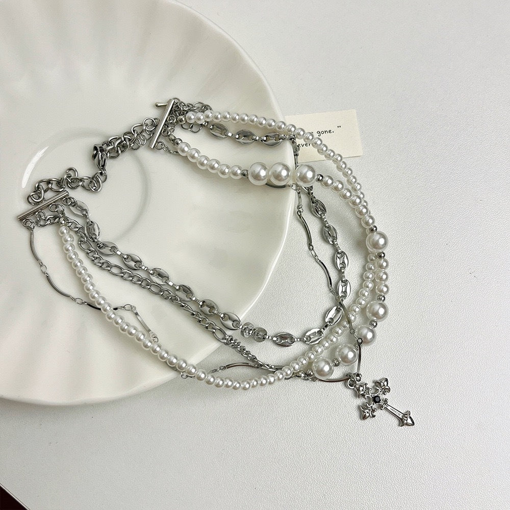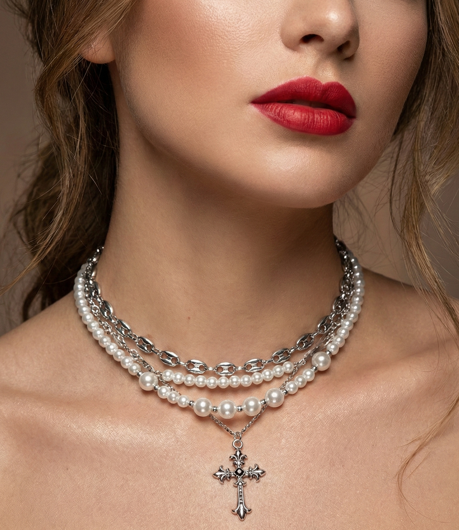 Дизайн: багатошаровий чокер — поєднання перлинних ниток і ланцюжка з підвіскою-хрестиком