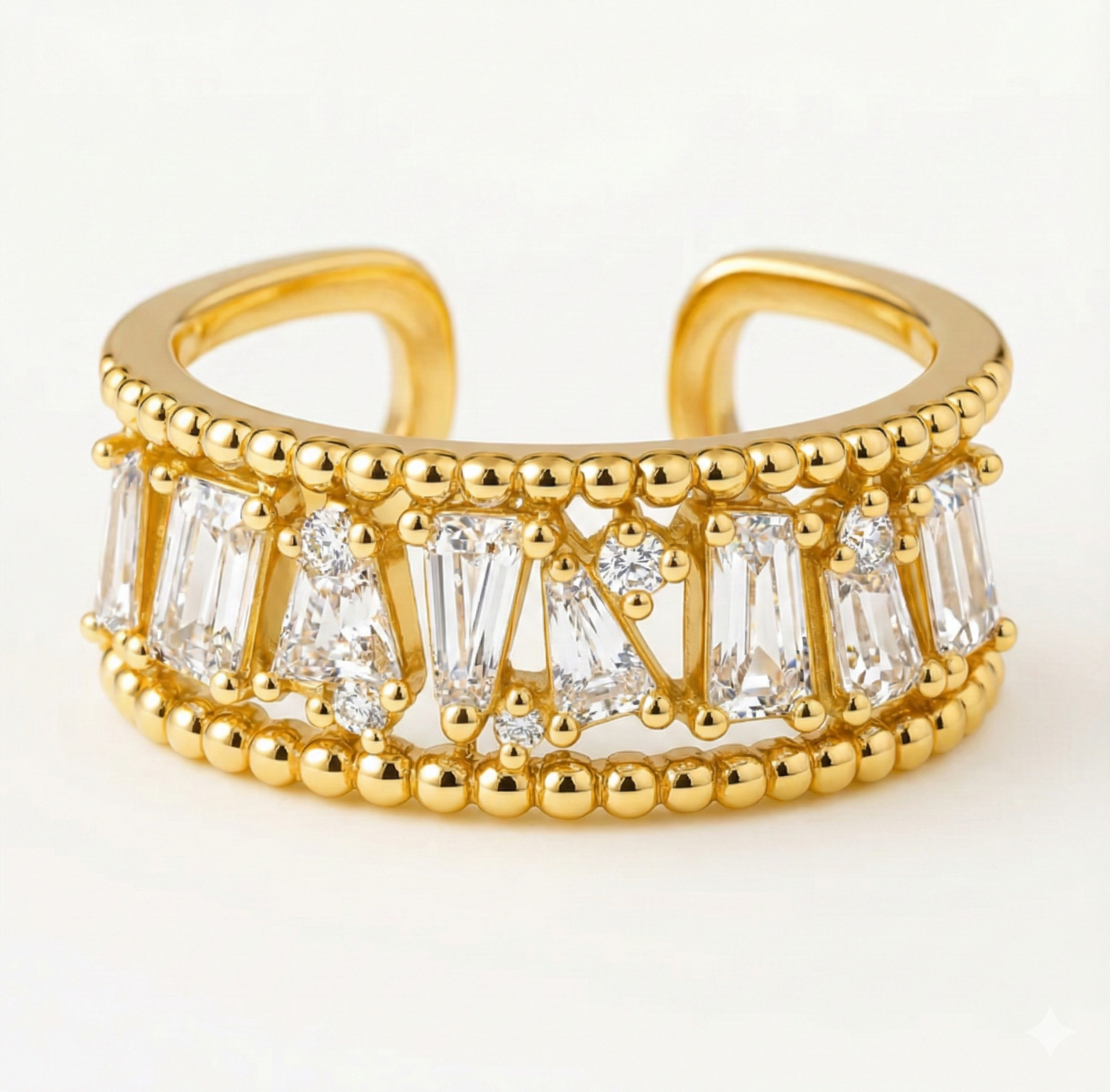 • Дизайн: Каблучка з двома рядами декоративного оздоблення, що обрамляють вставки з різнокольоровим або прозорим склом