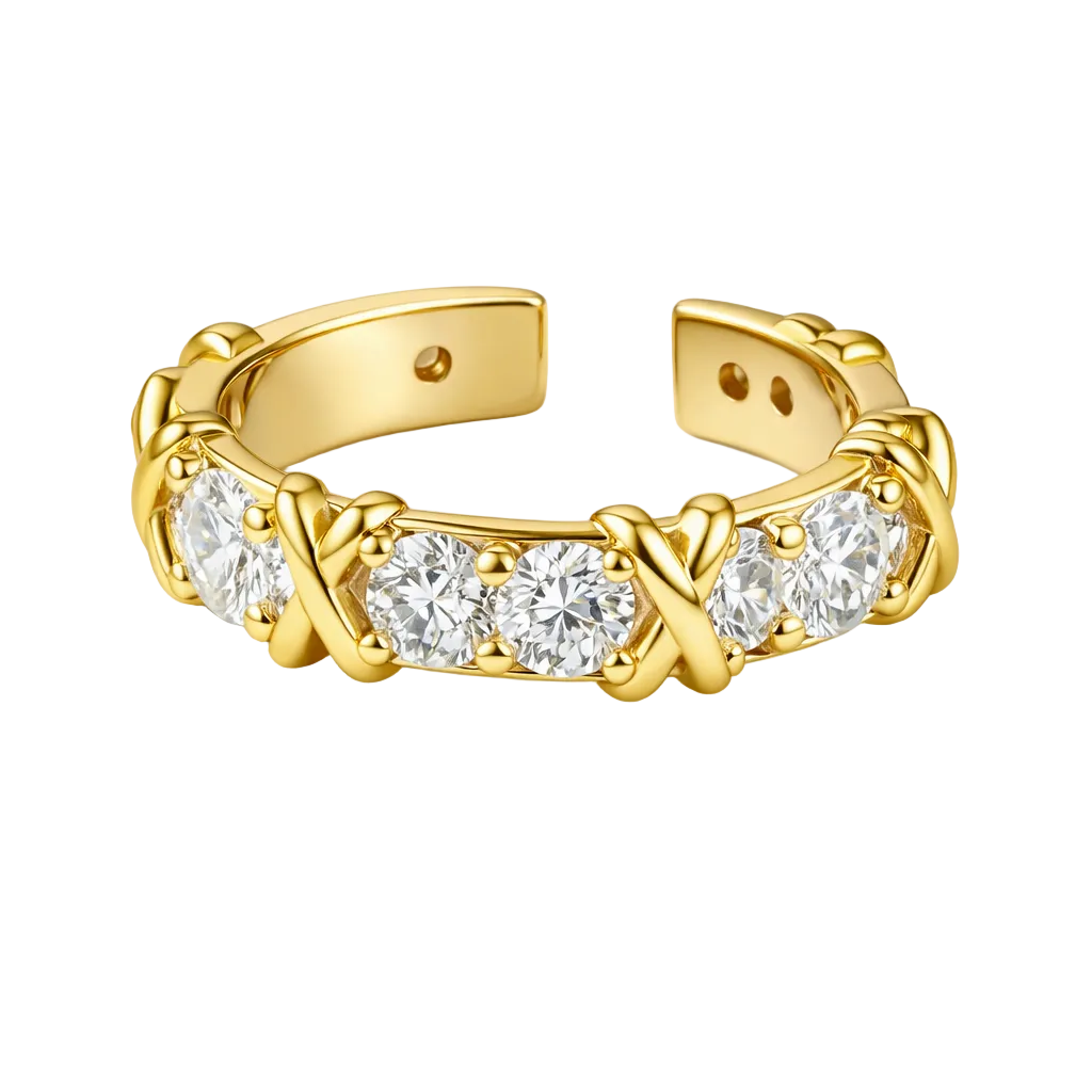 Ця каблучка поєднує блиск великих прозорих вставок і вишукані декоративні елементи у вигляді перехресних деталей. Двоколірний дизайн створює ефект контрасту та робить прикрасу яскравим акцентом образу.