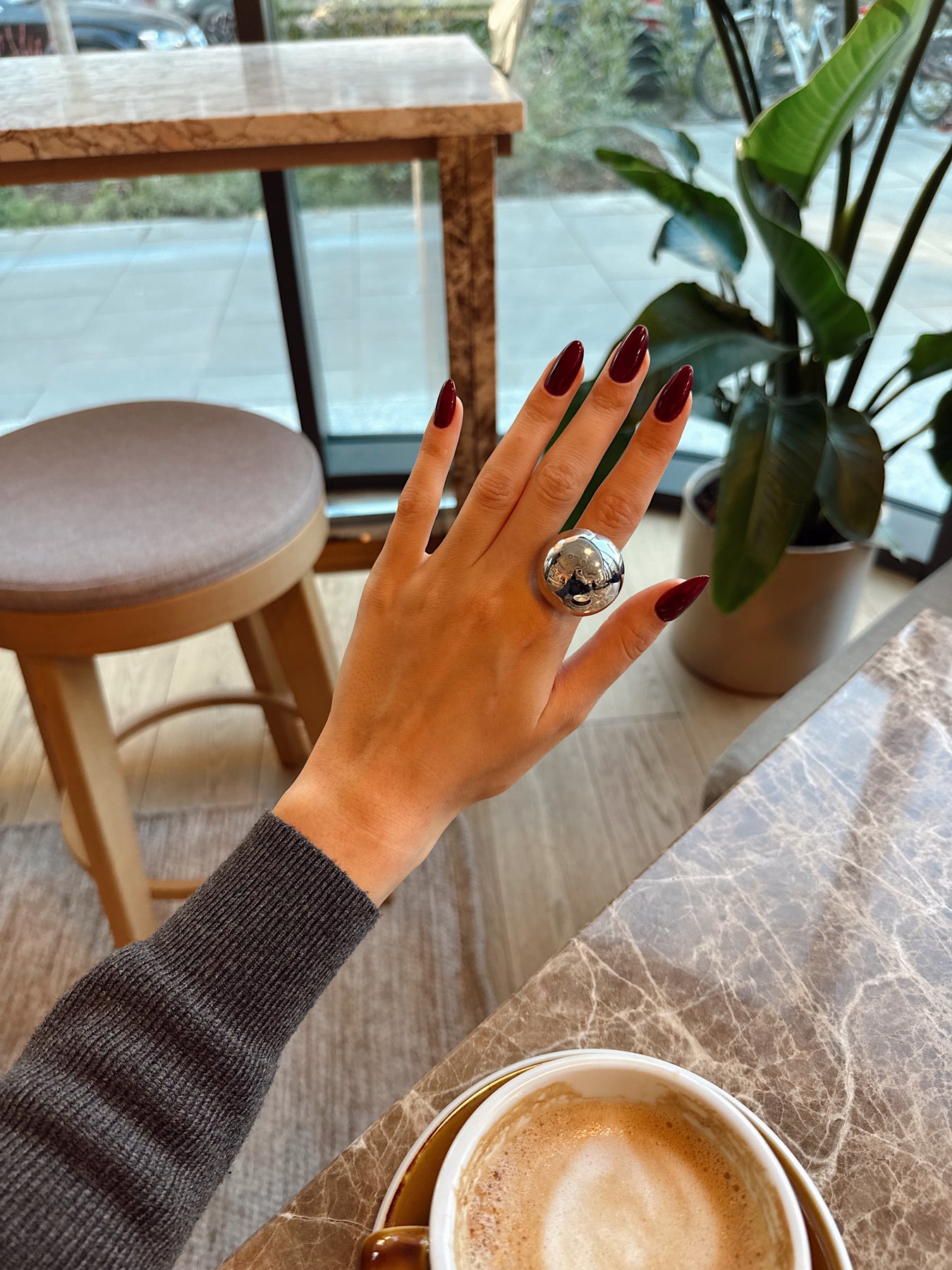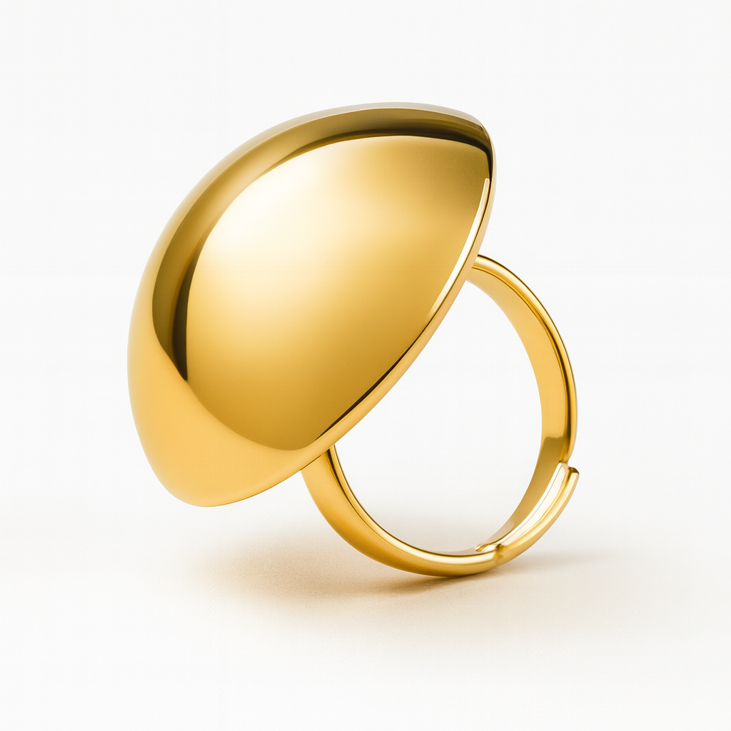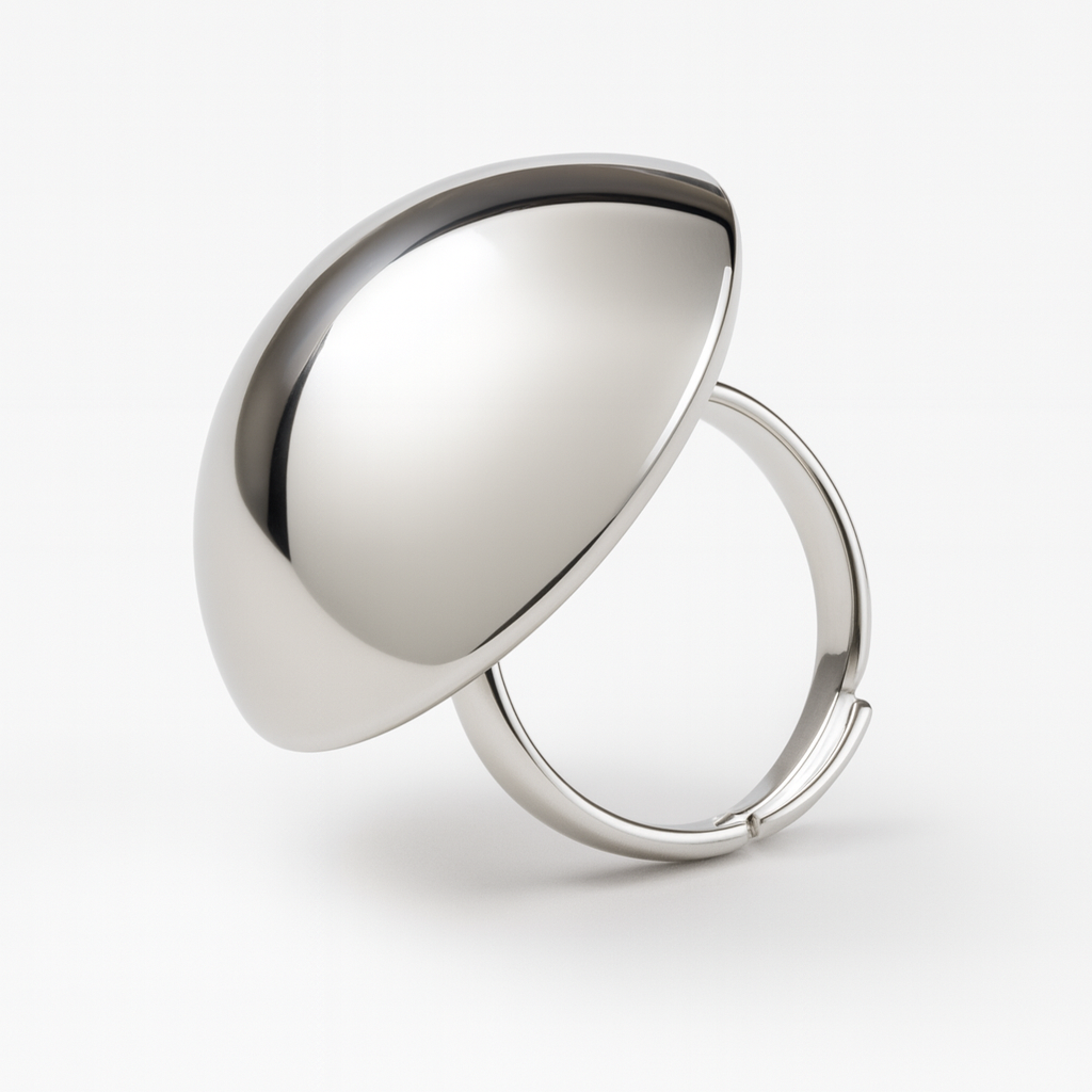 Об’ємна та смілива каблучка з гладкою дзеркальною поверхнею — справжній акцент у стилі сучасної скульптурної біжутерії. Завдяки округлій формі та м’яким відблискам вона виглядає як арт-об’єкт, що притягує погляди з першого жесту. Легко поєднується з мінімалістичним одягом і додає образу стриманої розкоші.