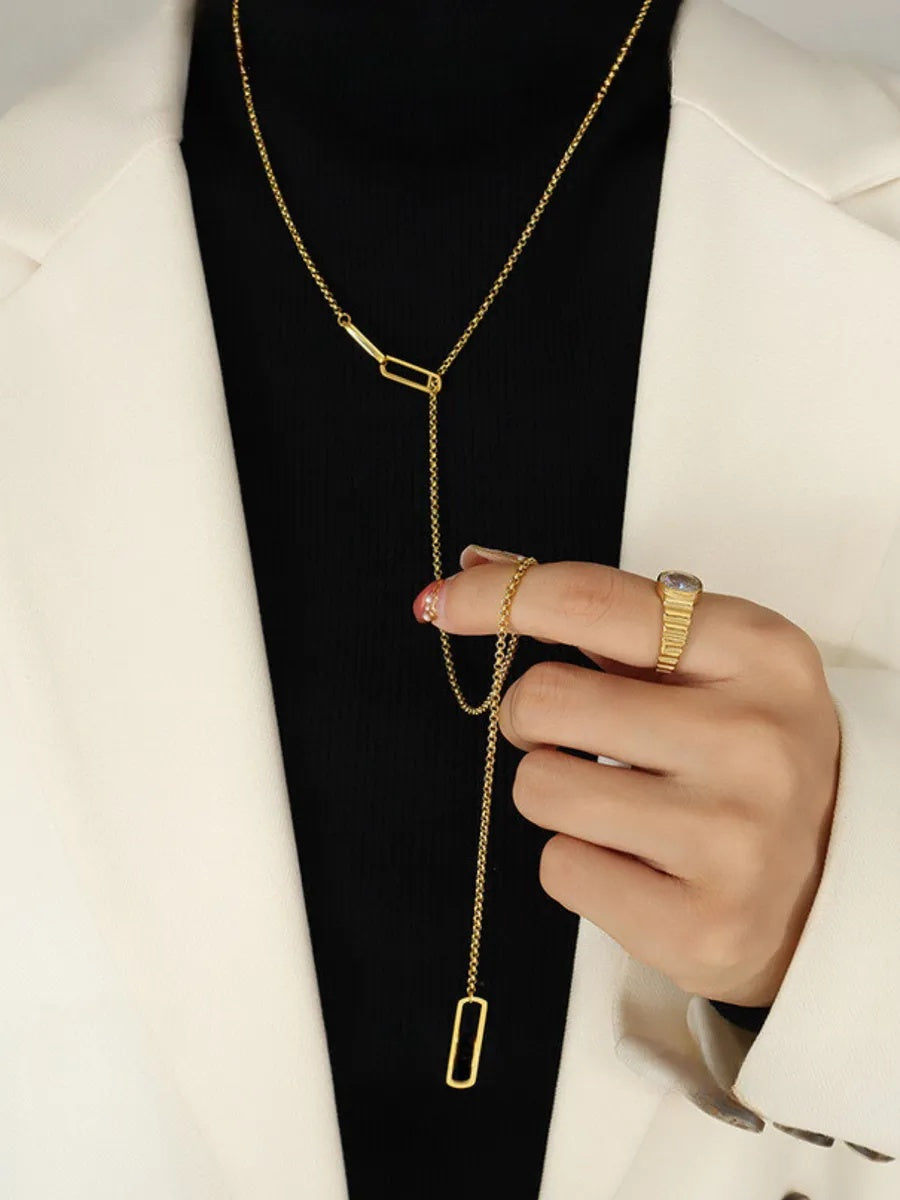 Один ланцюжок — безліч варіантів. Завдяки змінному способу застібки це кольє можна носити асиметрично або класично. Мінімалістичні геометричні елементи додають образу архітектурної чіткості. Легко комбінується з базовими речами або костюмами.
