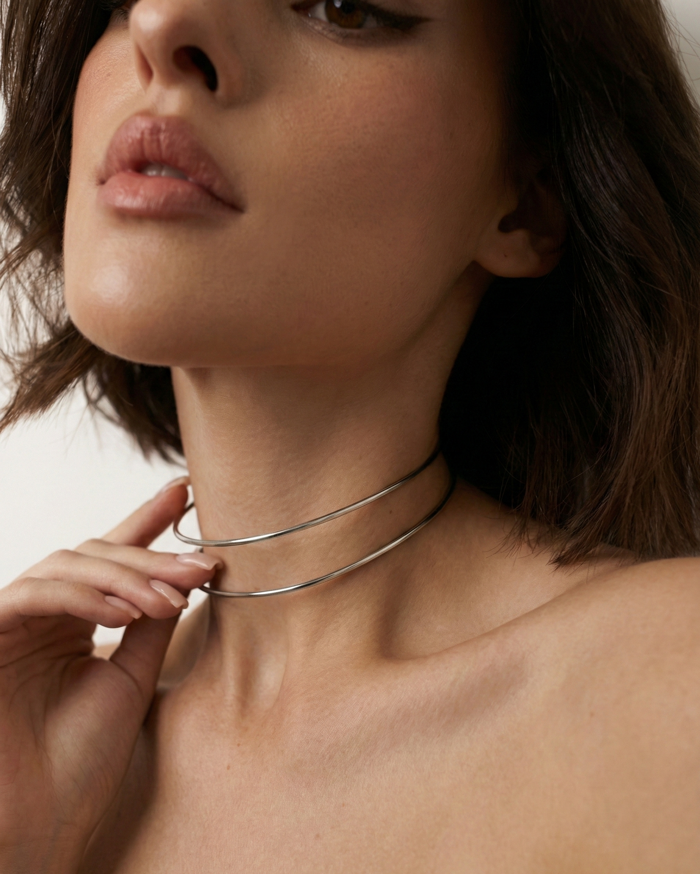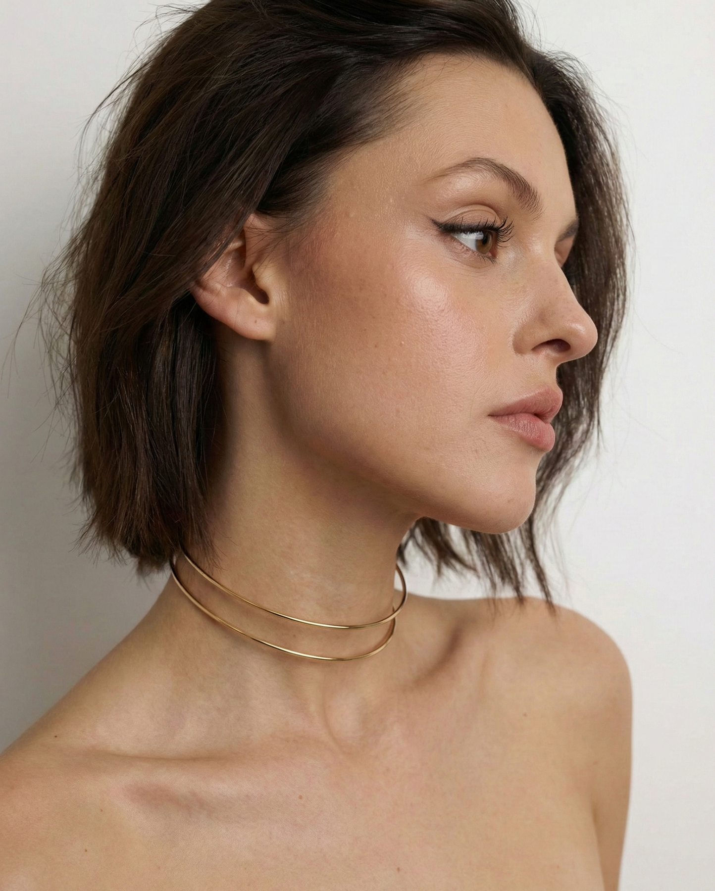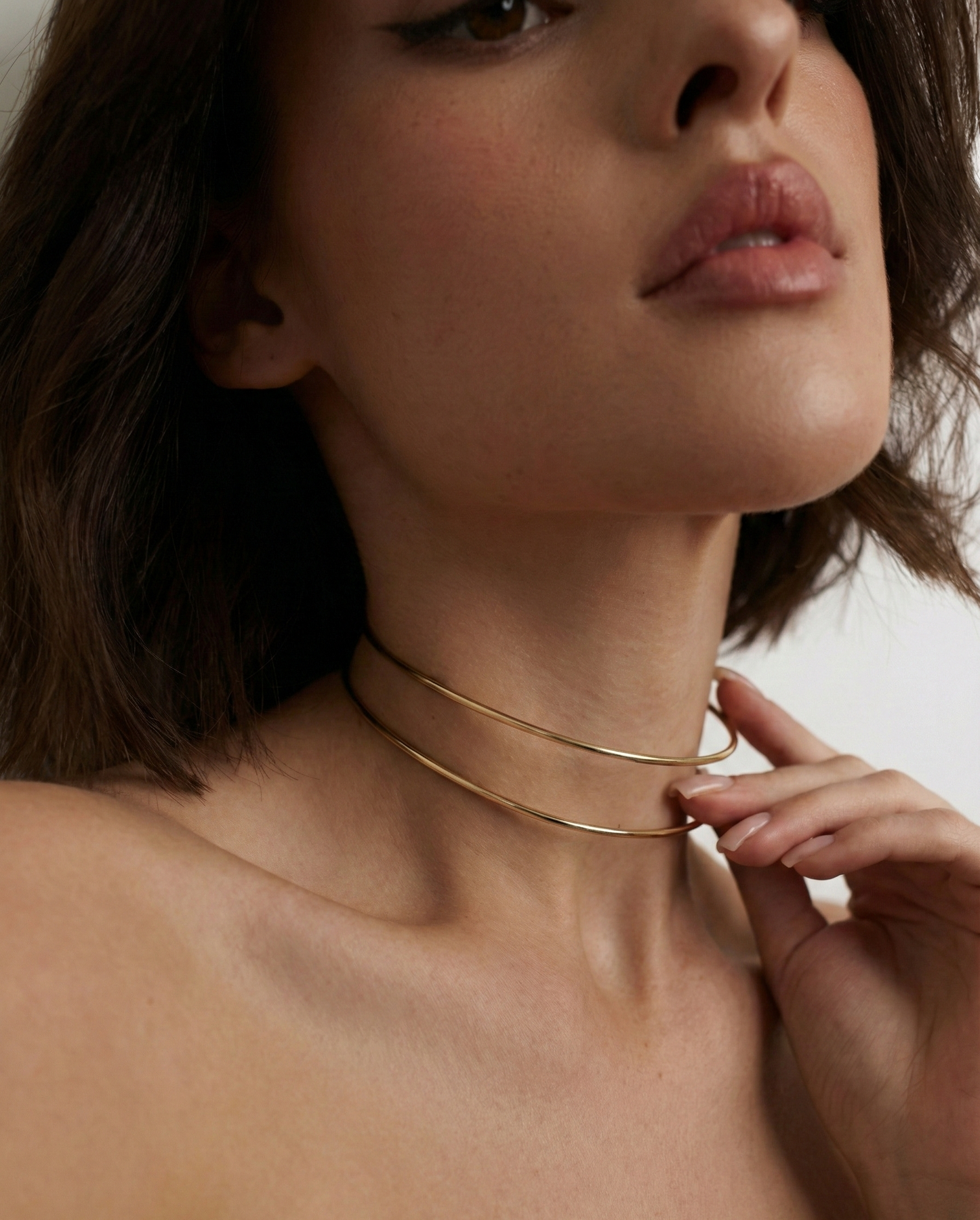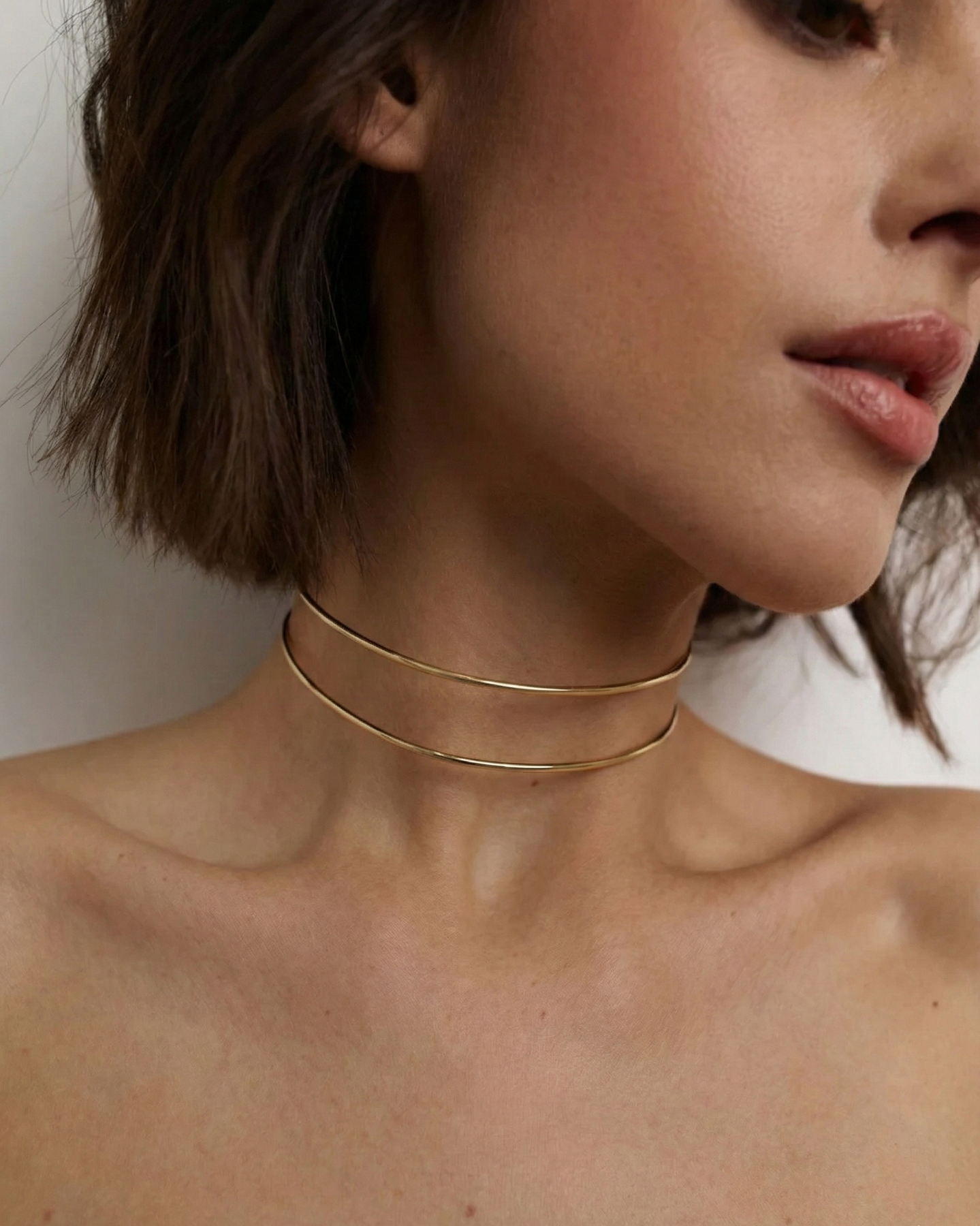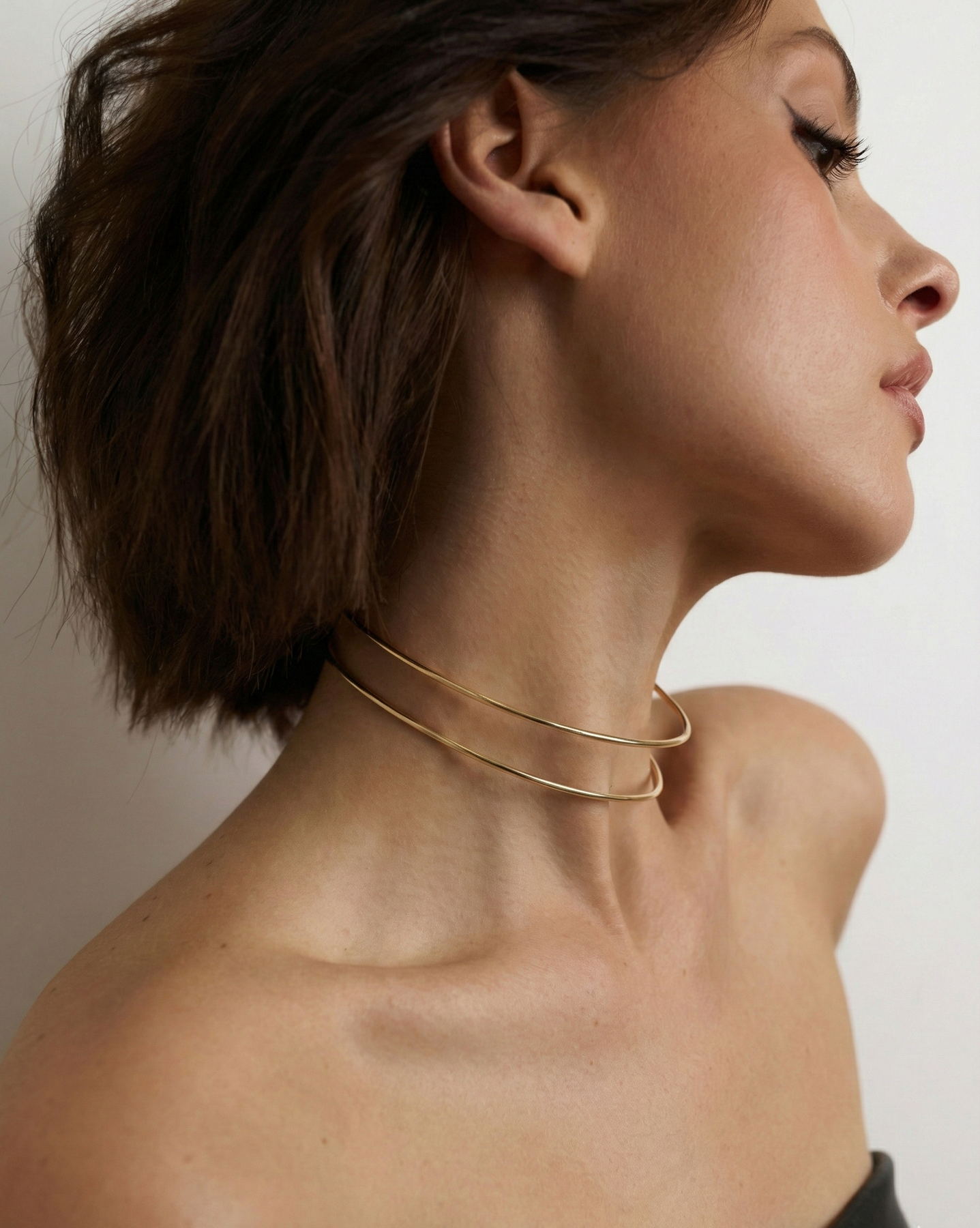 Витончене мінімалістичне намисто із золотистим покриттям. Дві тонкі лінії утворюють елегантну форму, що делікатно огортає шию та підкреслює лінію декольте. Легке, витончене й універсальне — пасує як до повсякденних, так і святкових образів.